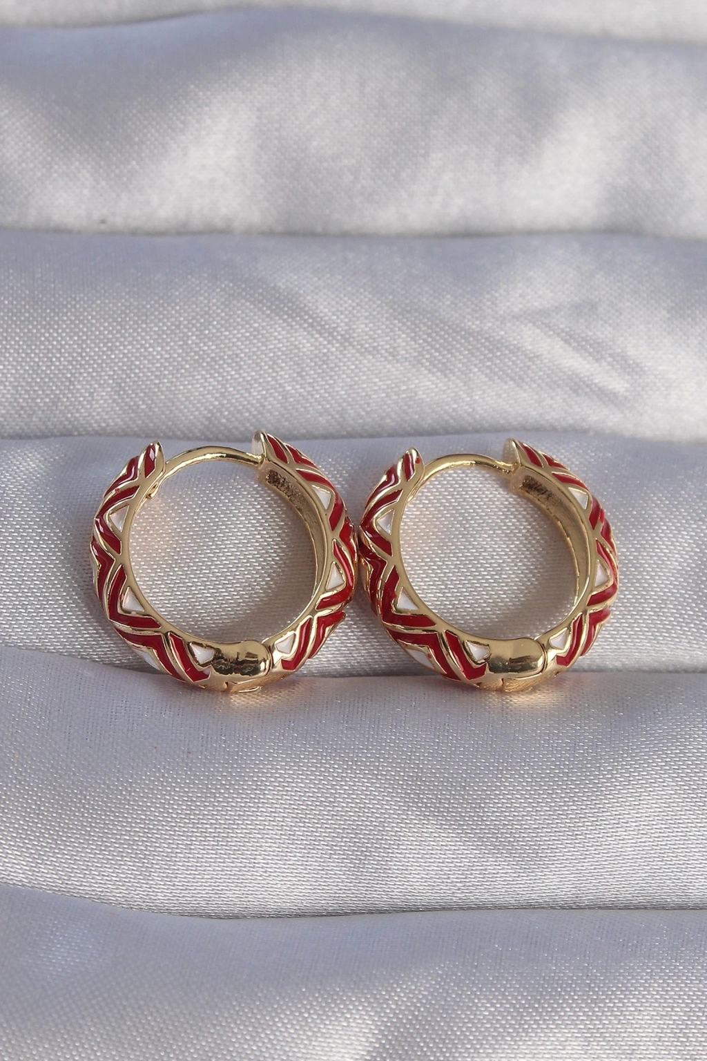 ® Pirinç Gold Renk Kırmızı Etnik Desenli Halka Küpe