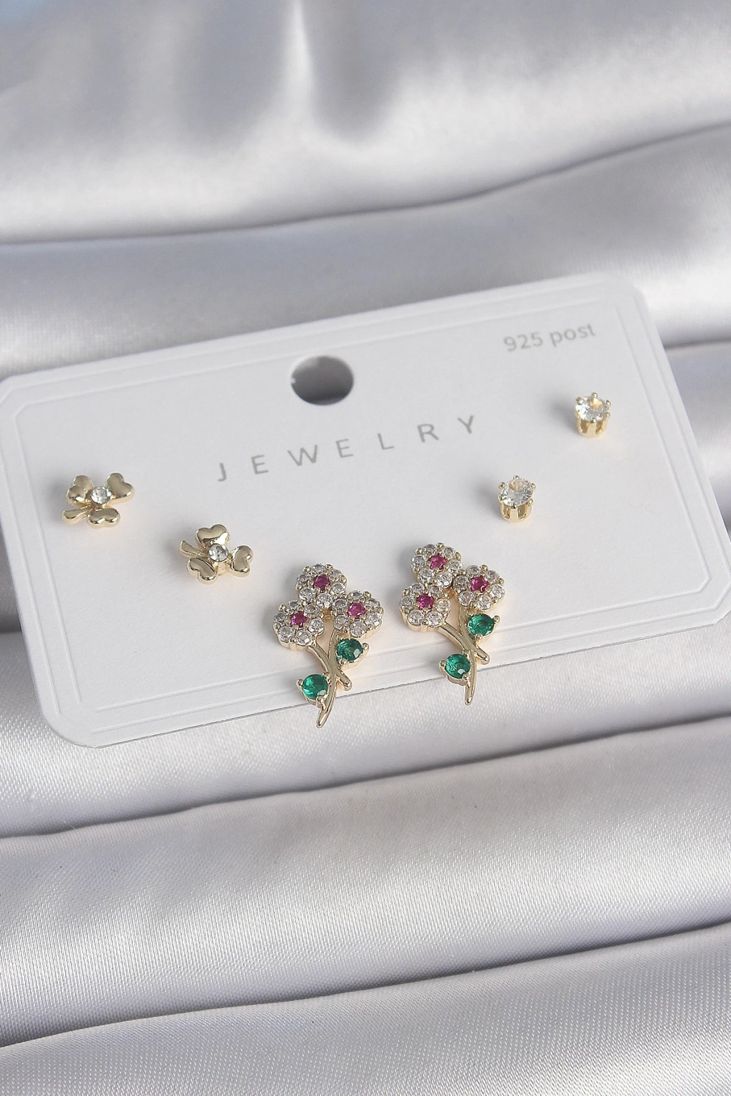 ® Pirinç Gold Renk Renkli Zirkon Taşlı Çiçek Model Yaprak Detay 925 Ayar Gümüş Çivi Kadın Küpe Seti