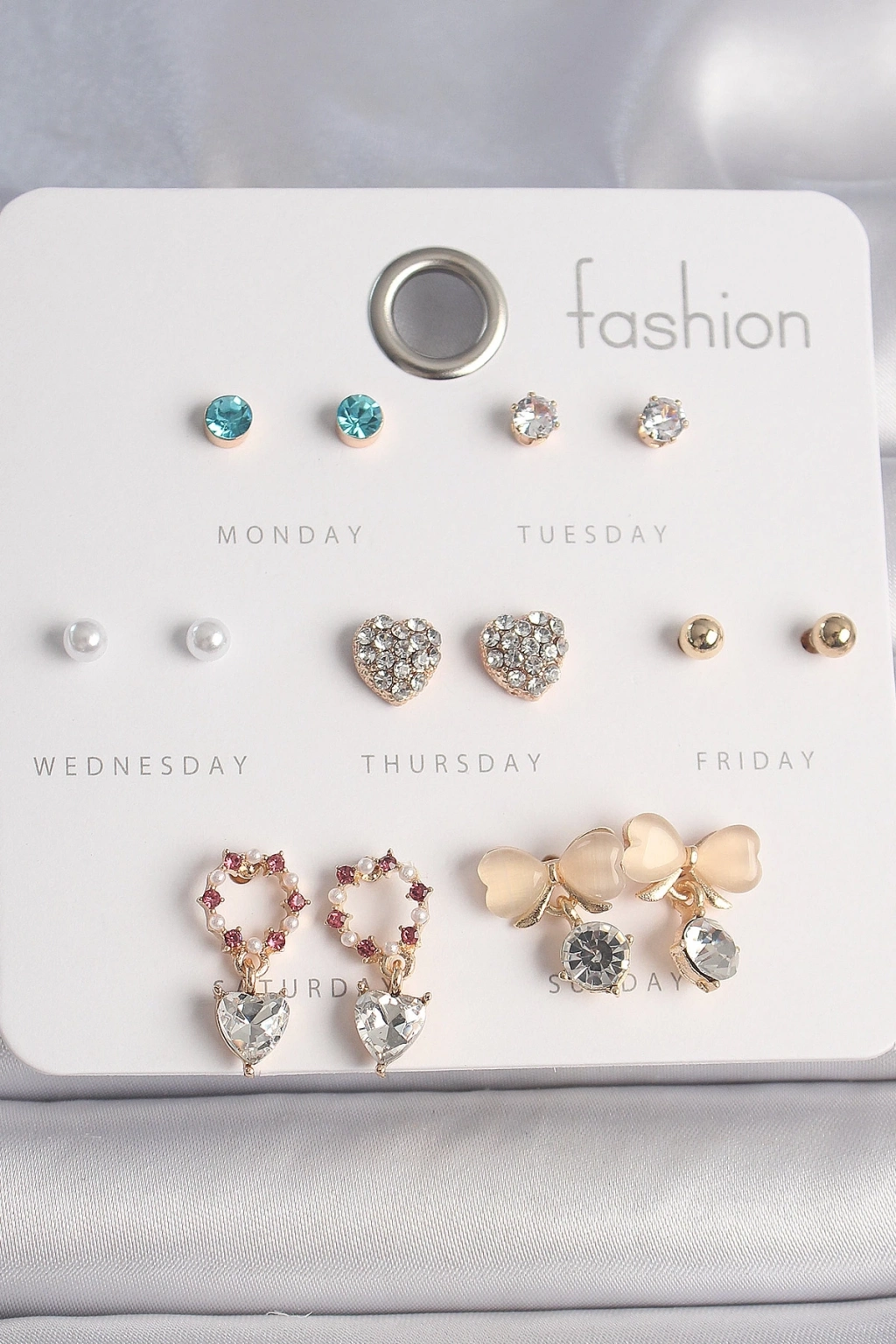 ® Pirinç Gold Renk Zirkon Taşlı Kalp Beyaz Mineli Fiyonk Figür 7 Çift Kadın Küpe Seti