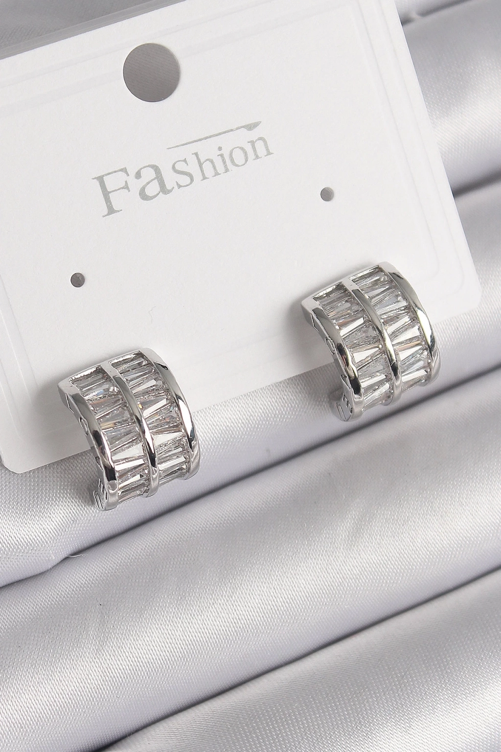 ® Pirinç Gümüş Renk Çift Sıra Zirkon Taşlı Kadın Küpe