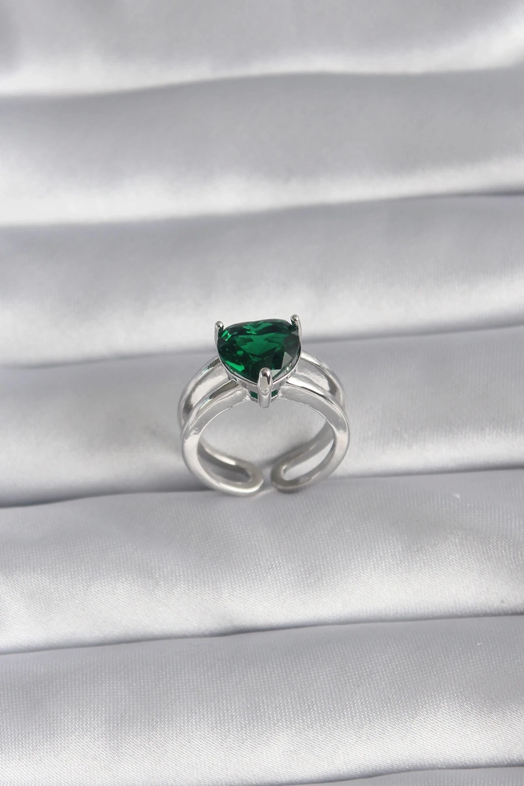 ® Pirinç Gümüş Renk Yeşil Zirkon Taşlı Tek Taş Model Kadın Yüzük