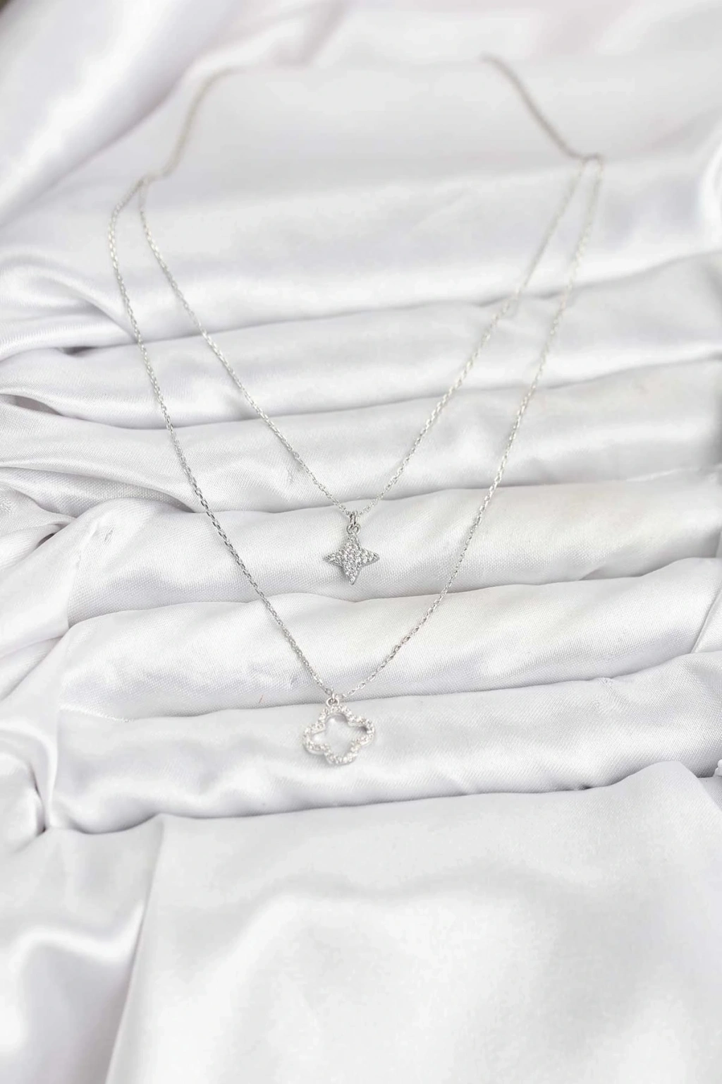 ® Pirinç Gümüş Renk Yonca Model 2'li Kadın Kolye