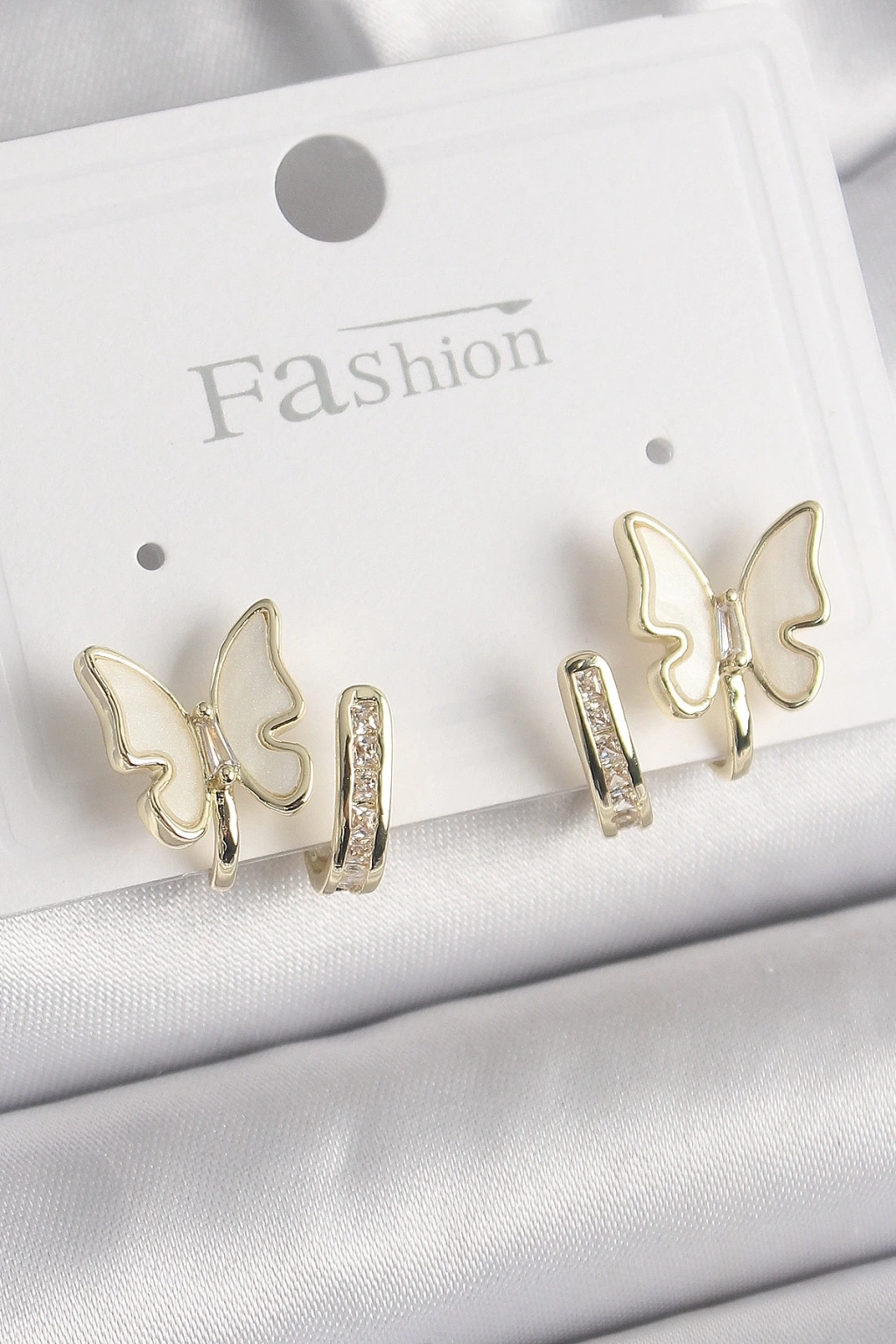 ® Pirinç Gümüş Renk Zirkon Taş Detaylı Beyaz Sedefli Kelebek Model Kadın Küpe