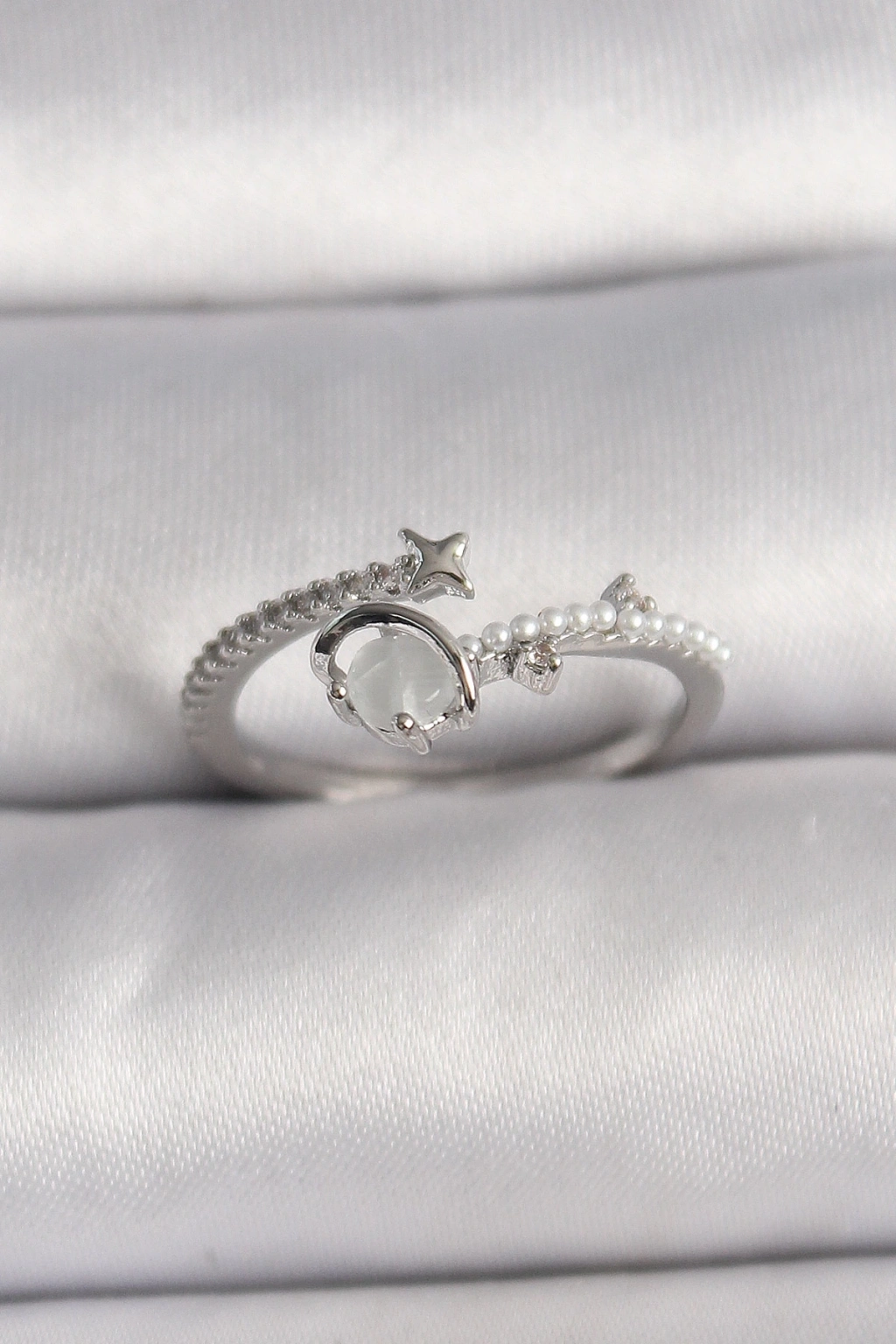 ® Pirinç Gümüş Renk Zirkon Taşlı Beyaz Mineli Yıldız Detay Ayarlanabilir Kadın Yüzük