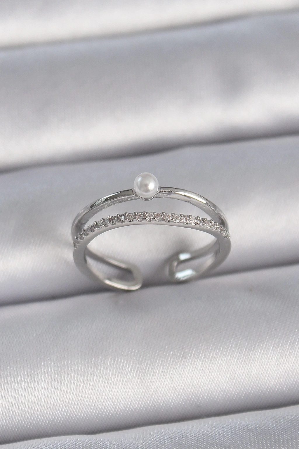 ® Pirinç Gümüş Renk Zirkon Taşlı İnci Detay Ayarlanabilir Model Kadın Yüzük
