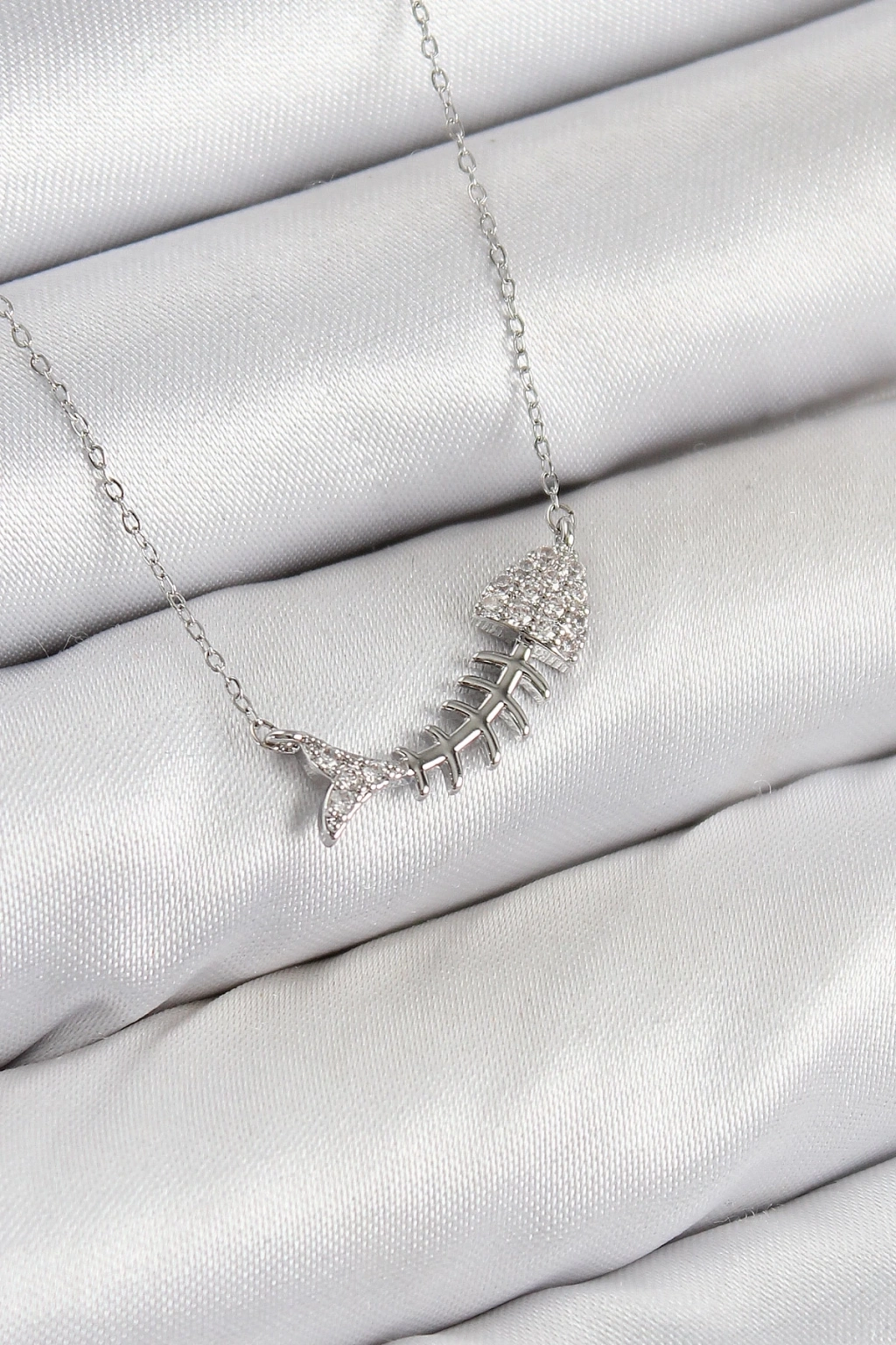 ® Pirinç Zirkon Taşlı Balık Kılçığı Model Gümüş Renk Kadın Kolye