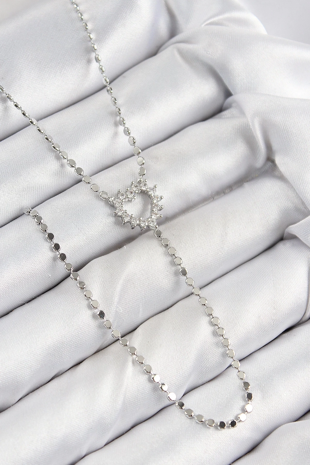 ® Pirinç Zirkon Taşlı Ezme Zincirli Kalp Model Gümüş Renk Y Kolye