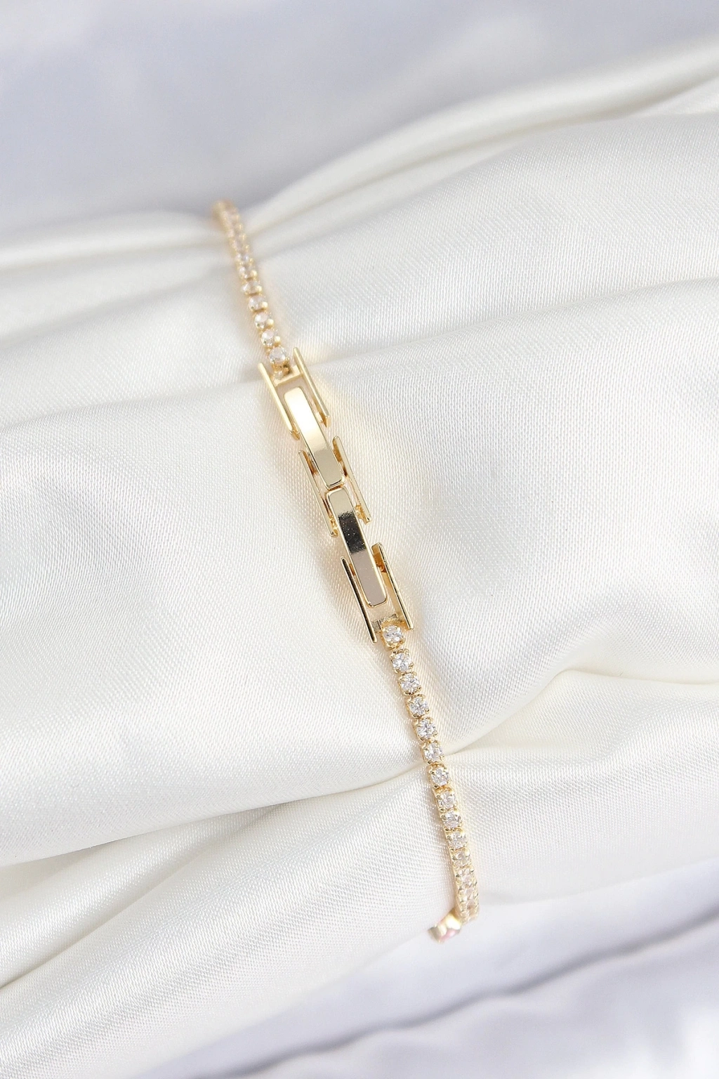 ® Pirinç Zirkon Taşlı Kare Model Gold Renk Kadın Bilekilk