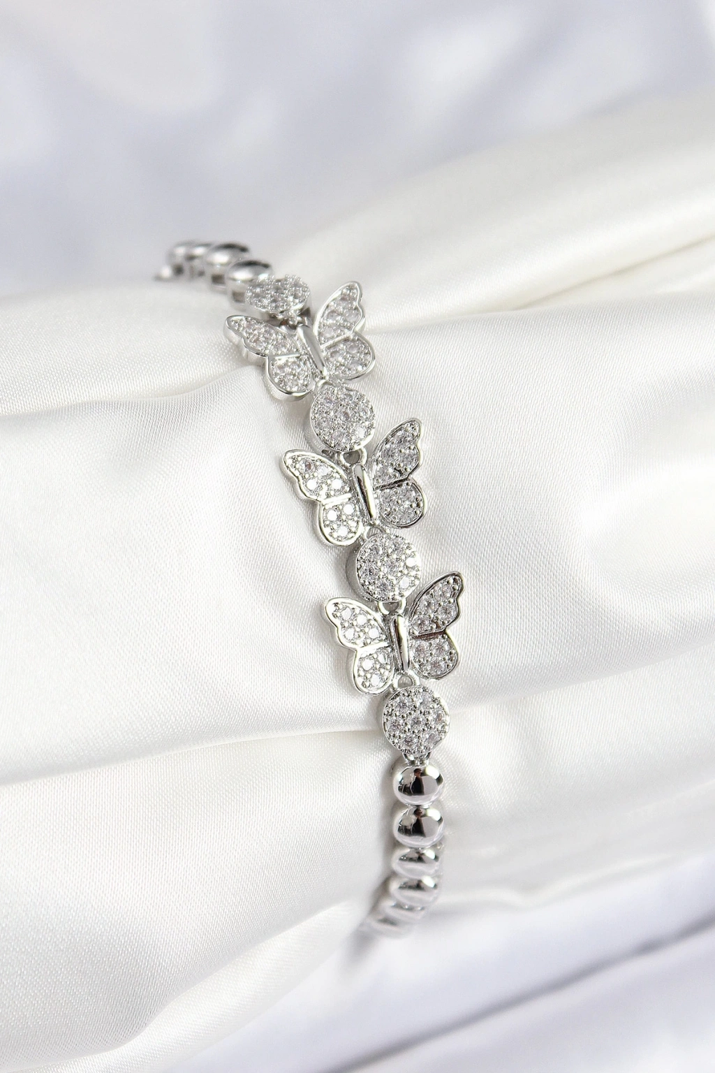 ® Pirinç Zirkon Taşlı Kelebek Model Gümüş Renk Kadın Bileklik