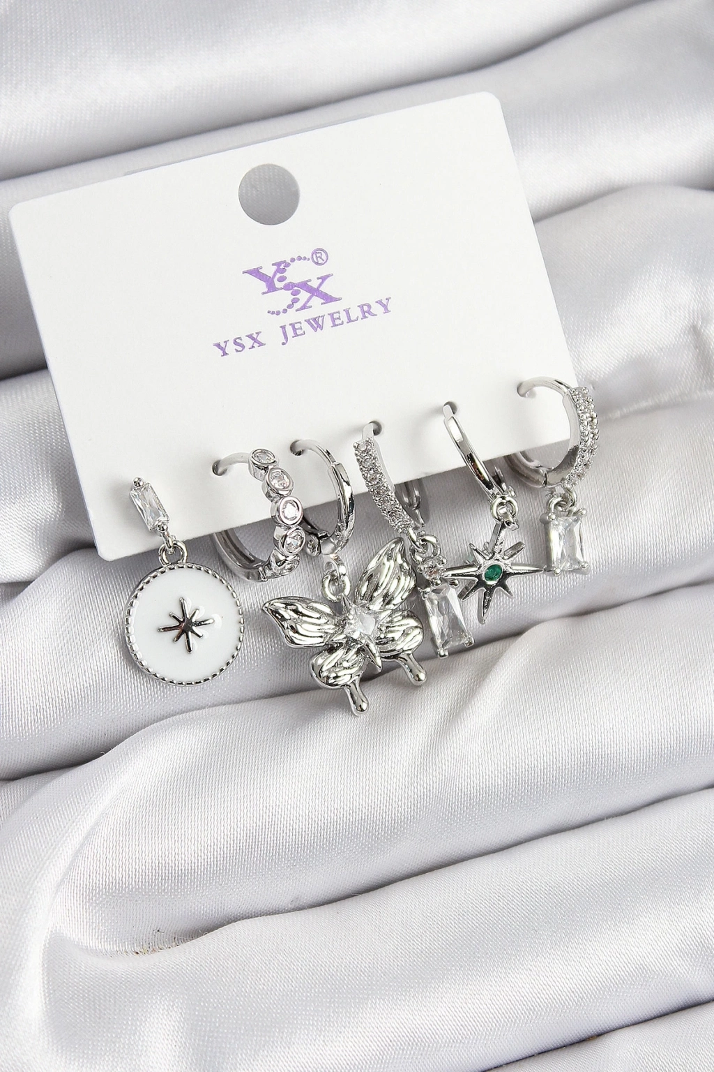 ® Pirinç Zİrkon Taşlı Kelebek ve Yıldız Model Gümüş Renk 3'lü Çift Kadın Küpe