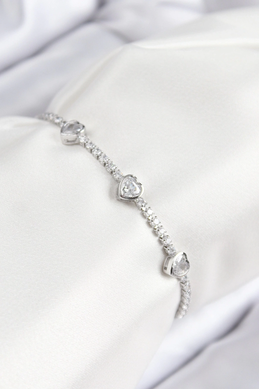 ® Pirinç Zirkon Taşlı Sıralı Kalp Model Gümüş Renk Asansörlü Kadın Bileklik