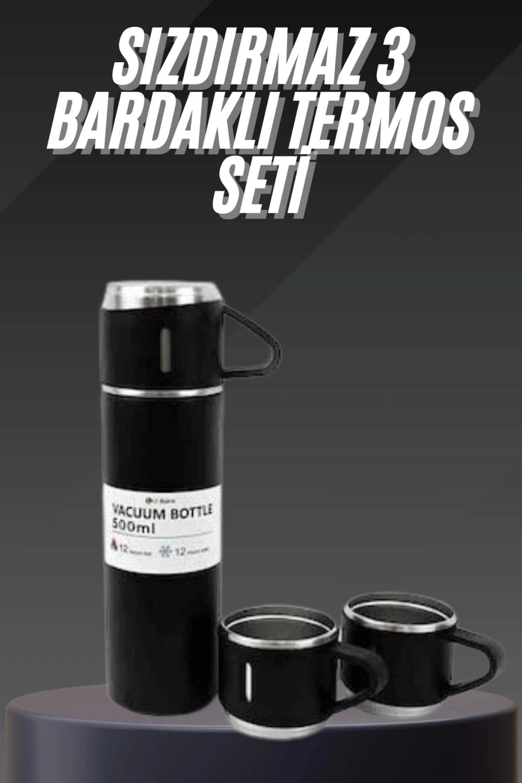 ® Termos Seti Paslanmaz Çelik 3 Bardaklı Vakumlu Termos Set 500 Ml 12 Saate Kadar Isı Koruma