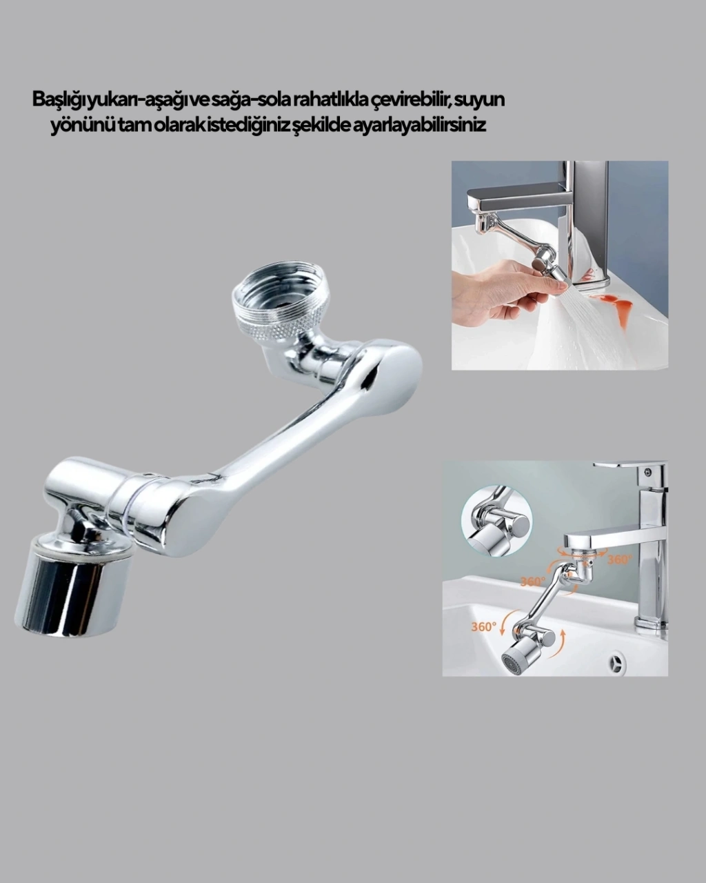 Modern evlerde hem kullanım kolaylığı hem de fonksiyonellik büyük önem taşırken, 1080° dönebilen üç segmentli musluk havalandırıcı bu ihtiyaçlara doğrudan yanıt veren bir tasarımla karşımıza çıkıyor. Geleneksel muslukların sınırlı hareket kabiliyeti, lavabonun bazı bölgelerine erişimde zorluk yaratırken bu yenilikçi aparat sayesinde suyu istediğiniz açıya yönlendirmek mümkün hale geliyor. Üç parçalı robotik kol sistemi sayesinde musluk başlığını hem dikey hem yatay eksende döndürebilir, toplamda 1080° hareket alanıyla tam kontrol sağlayabilirsiniz.Bu gelişmiş hareket kabiliyeti, özellikle ev içi hijyen işlemlerinde büyük avantaj sağlar. Yüz yıkama, ağız bakım, tıraş, bulaşık yıkama, sebze ve meyve temizleme gibi günlük rutinlerde suyu doğru yere yönlendirerek hem zamandan tasarruf eder hem de konforu artırır. Çocuklar ve yaşlılar için suya erişimi kolaylaştırır; musluğu eğmek, yaklaşmak veya altına girmek zorunda kalmadan rahat bir kullanım sunar.Havalandırıcı uç sistemi, suyun akışını düzenleyerek sıçramayı azaltır ve su tasarrufu sağlar. Yüksek basınç gerektirmeden güçlü ve dengeli bir akış oluşturur. Bu da hem daha temiz bir lavabo yüzeyi hem de daha ekonomik su tüketimi anlamına gelir. Ürün, dayanıklı ABS + metal materyallerden üretilmiştir ve korozyona karşı dayanıklıdır. Uzun süreli kullanımlarda bile eklem bölgelerinde gevşeme yapmaz.Montajı oldukça pratiktir. Çoğu standart musluk başlığı ile uyumludur ve herhangi bir tesisat bilgisi gerektirmez. Yalnızca birkaç saniyede vidalayarak takabilir ve hemen kullanmaya başlayabilirsiniz. Hem mutfak hem banyo lavabolarında mükemmel bir kullanım sunar.Kompakt, estetik ve modern tasarımı ile musluğa zarif bir dokunuş katarken, fonksiyonel özellikleri sayesinde günlük yaşam kalitesini artırır. Geniş açılı hareket kabiliyeti sayesinde musluk kullanımını tamamen dönüştüren bu havalandırıcı, evinizde fark yaratacak yenilikçi bir üründür.