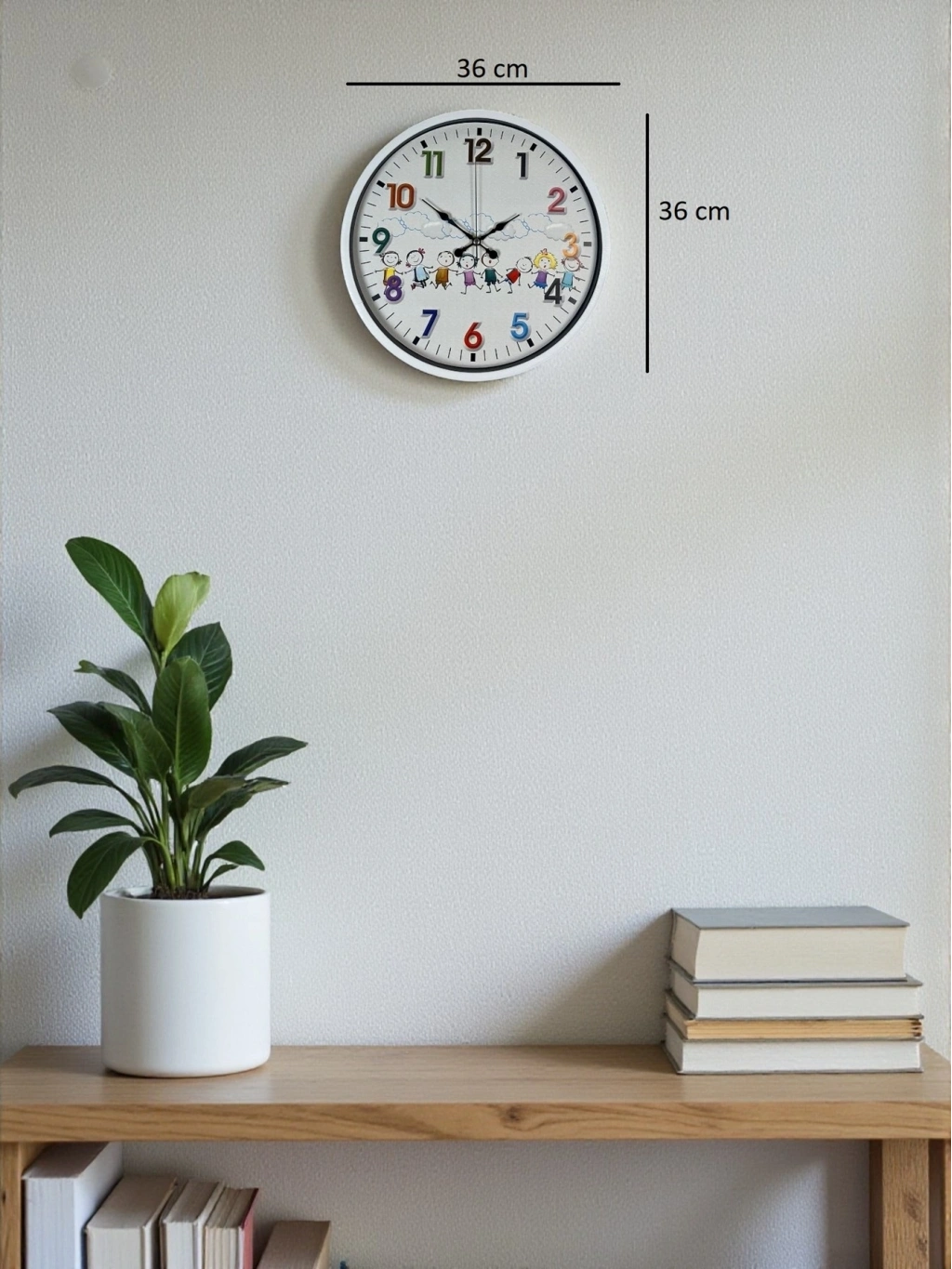 Renkli rakamları ve neşeli çocuk figürleriyle tasarlanan bu 36 cm çocuk odası duvar saati, miniklerin odasına hem eğlence hem de düzen katar.