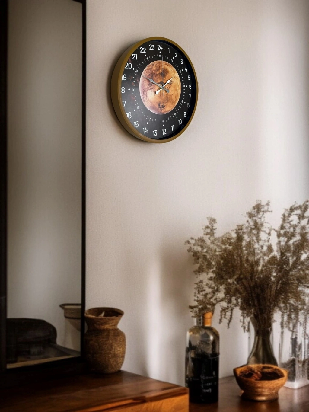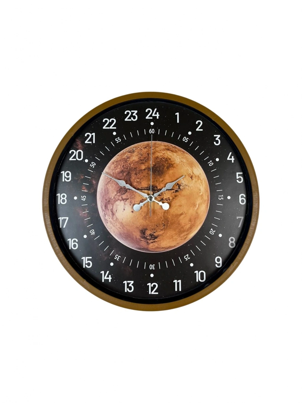 Klasik duvar saatlerinden farklı olarak 24 saatlik zaman dilimiyle çalışan özel kadran tasarımına sahip olan bu 36 cm duvar saati, zamanı alışılmışın dışında ve daha detaylı bir şekilde takip etmenizi sağlar. Kahverengi çerçevesi, koyu zemin üzerindeki gezegen temalı tasarımı ve net beyaz rakamlarıyla dikkat çeken bu model; hem dekoratif hem de fonksiyonel bir üründür.
