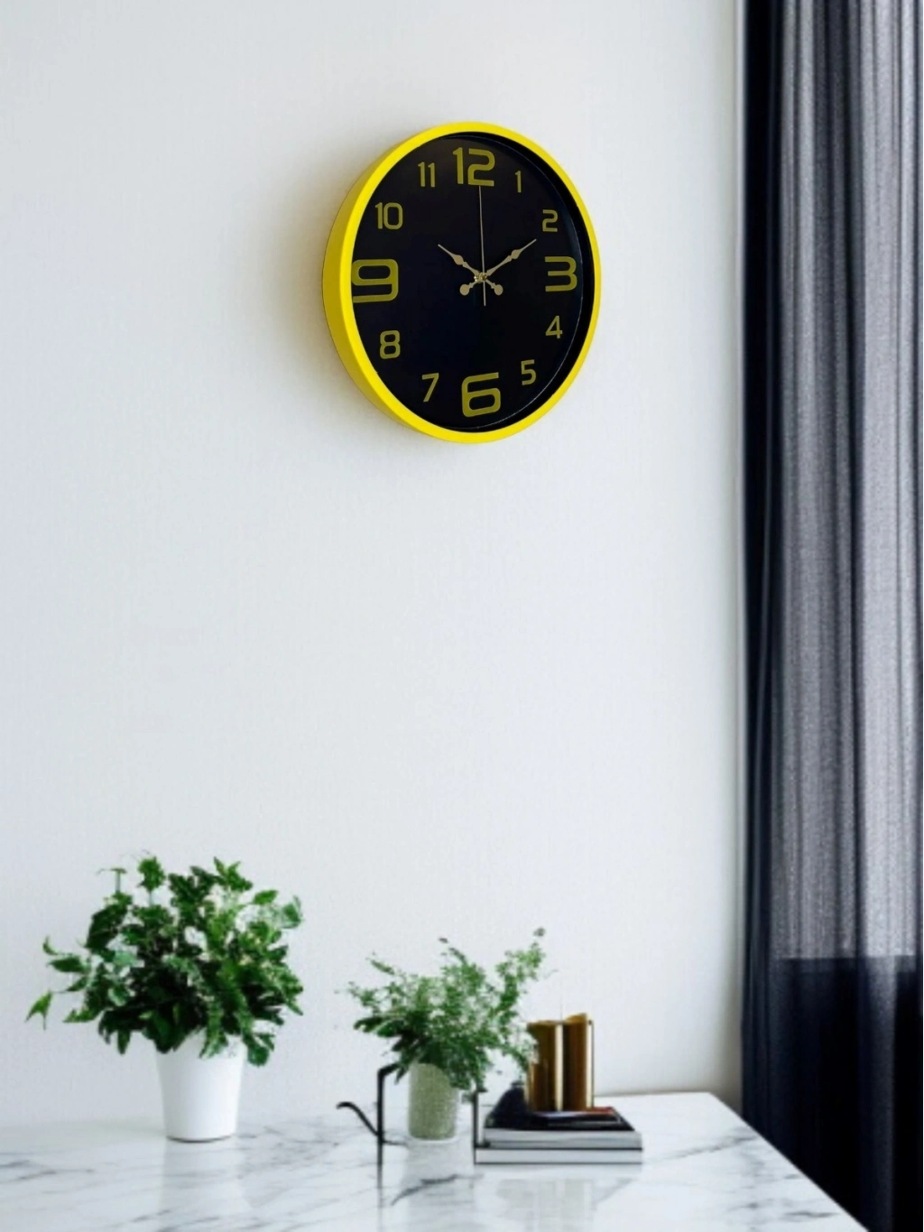 Canlı sarı çerçevesi ve koyu renk kadran tasarımıyla öne çıkan bu 36 cm duvar saati, bulunduğu ortama enerji ve modern bir karakter kazandırır. Altın tonlu rakamları ve kontrastlı kadran yapısı sayesinde saati uzaktan bile rahatlıkla okumak mümkündür.