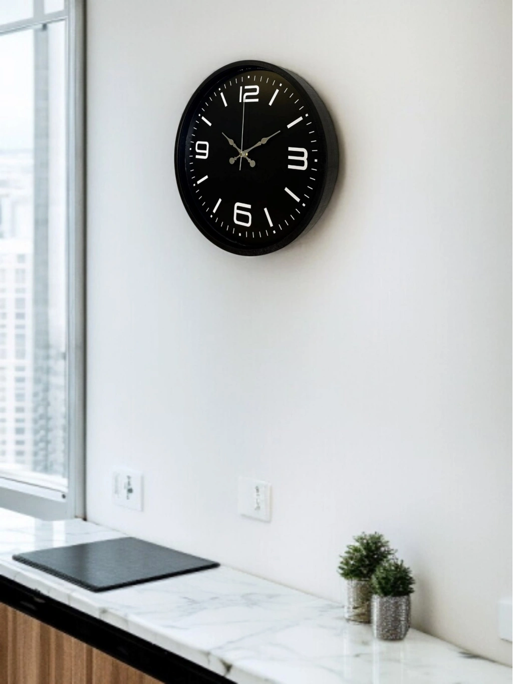 Mat siyah çerçevesi ve siyah kadranı üzerinde yer alan beyaz rakam ve indeksleri ile tasarlanan bu 36 cm duvar saati, güçlü kontrastı sayesinde saati tek bakışta net şekilde okuma imkânı sunar. Sade ve dengeli kadran tasarımı, modern yaşam alanları için zamansız bir şıklık sağlar.