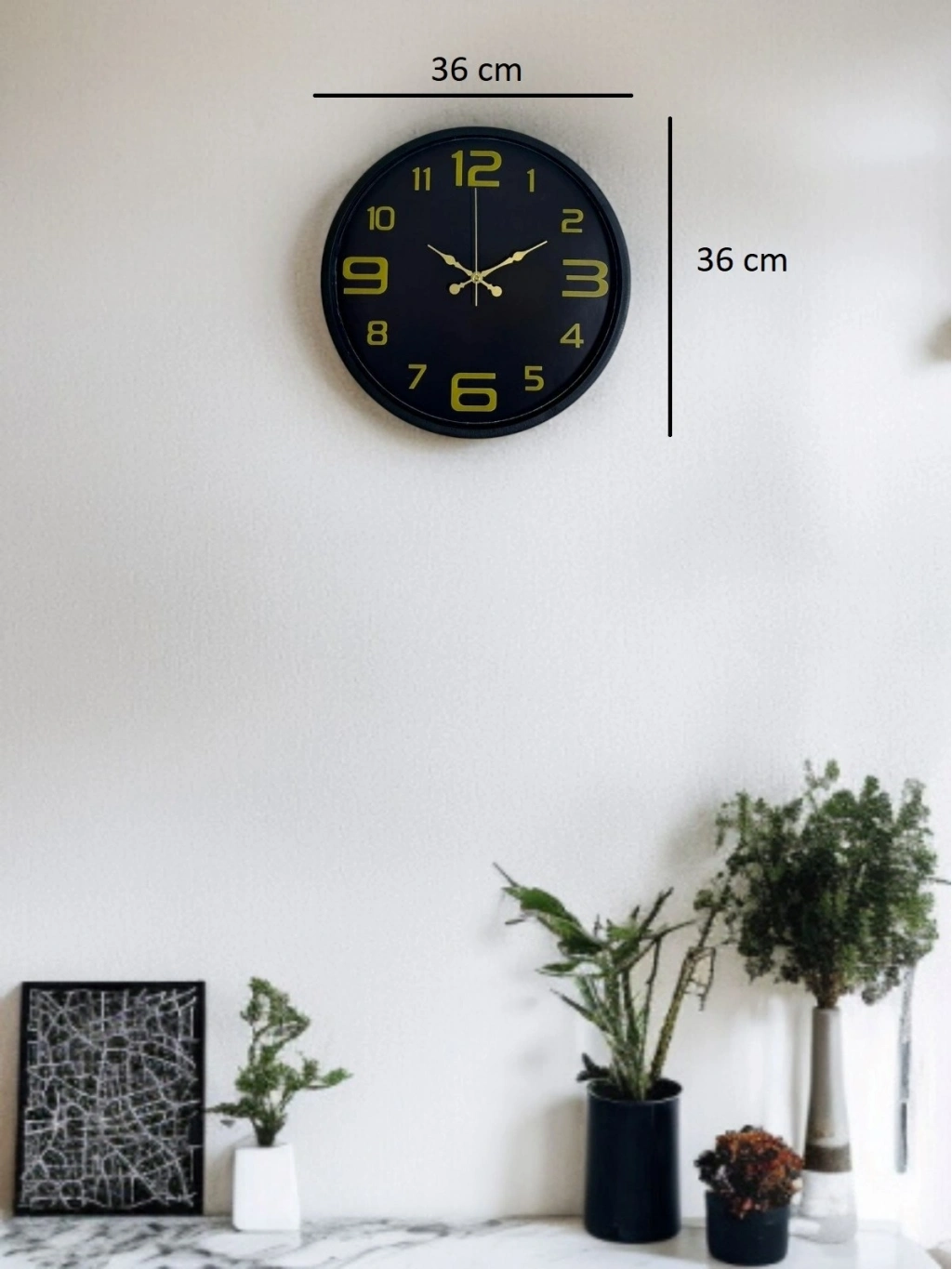 Mat siyah çerçevesi ve koyu kadranı üzerinde yer alan altın tonlu rakamları ile tasarlanan bu 36 cm duvar saati, bulunduğu ortama güçlü ve sofistike bir karakter kazandırır. Yüksek kontrastlı tasarımı sayesinde saati uzaktan bile net şekilde okumak mümkündür.