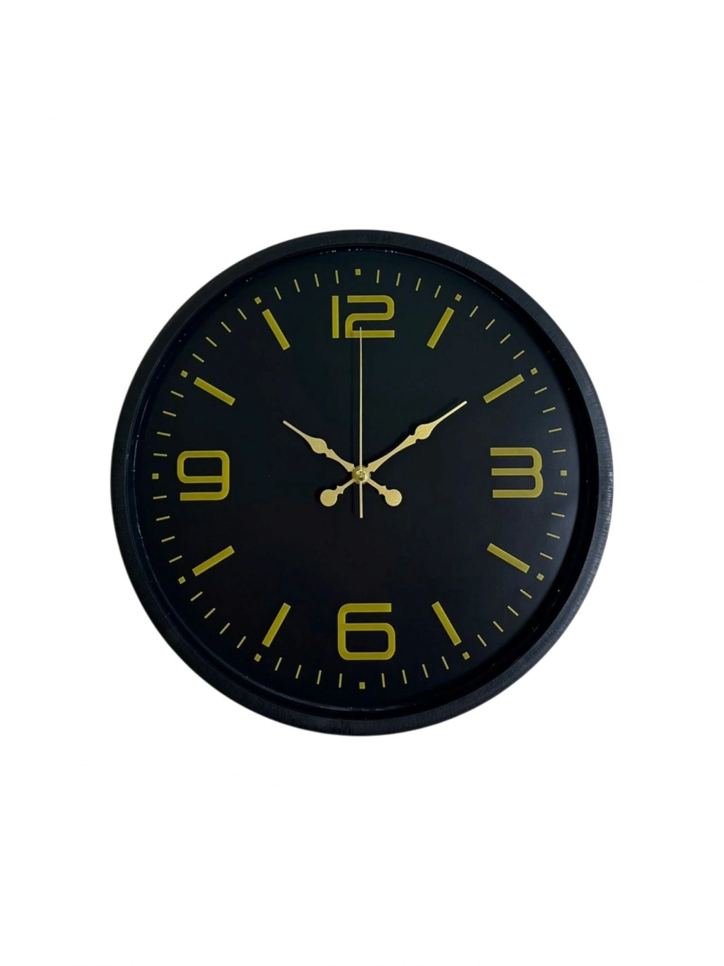 Siyah çerçevesi ve mat siyah kadranı üzerinde yer alan gold tonlu rakam ve indeksleri ile tasarlanan bu 36 cm duvar saati, modern ve şık bir duruş sunar. Minimal çizgilerle tasarlanmış kadranı, sade ama etkileyici bir dekoratif görünüm sağlar.