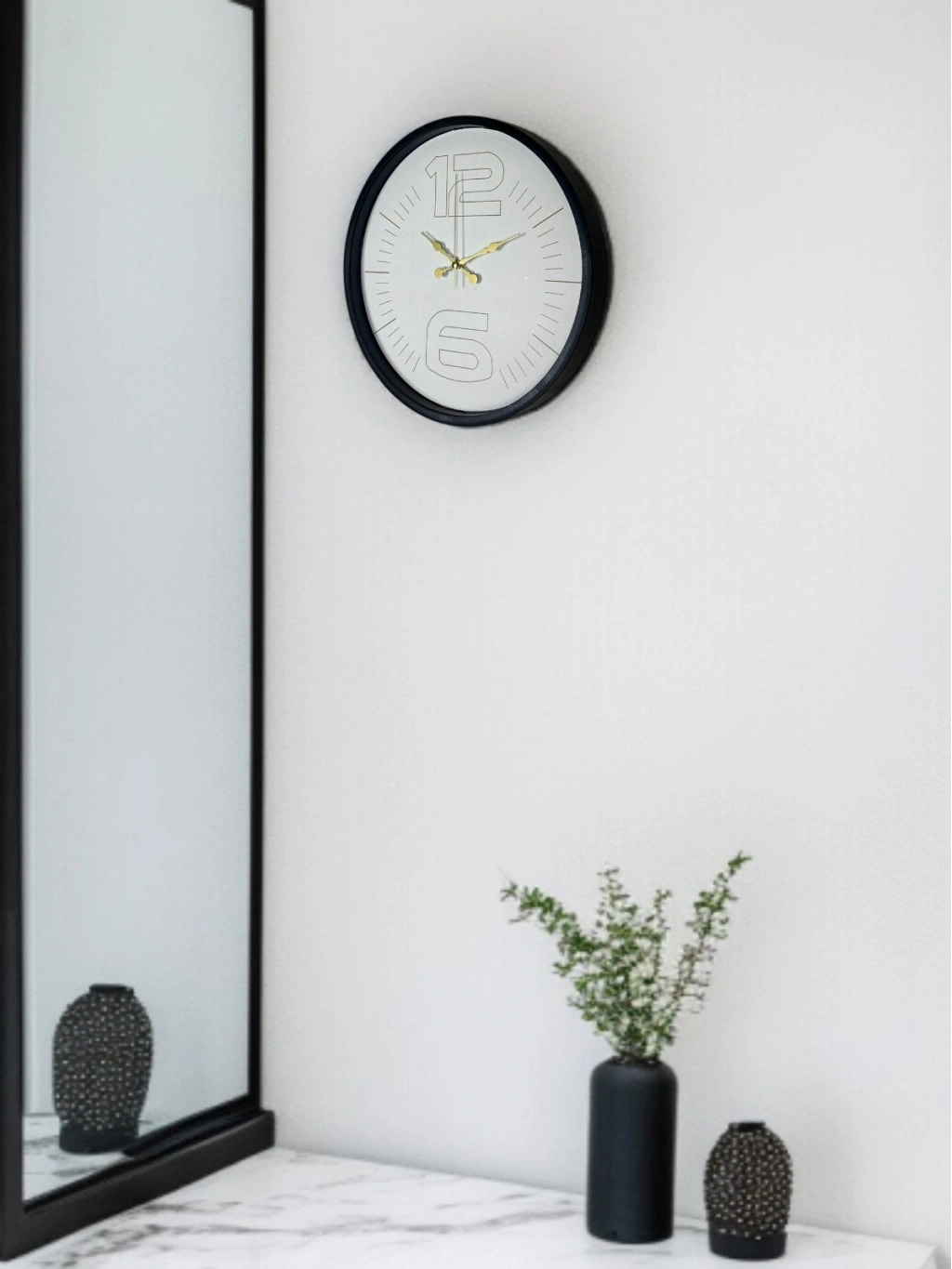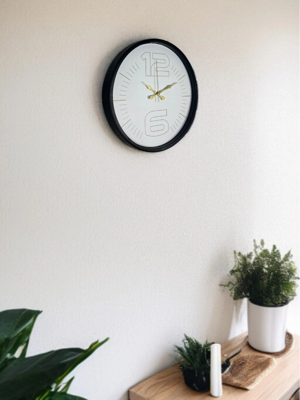Siyah çerçevesi ve açık renk kadranıyla kontrast oluşturan bu 36 cm duvar saati, modern dekorasyon anlayışını yansıtan özel bir tasarıma sahiptir. Büyük 12 ve 6 rakam detayı, saate karakter kazandırırken minimal çizgilerle desteklenen kadran yapısı sayesinde sade ama güçlü bir görünüm sunar.