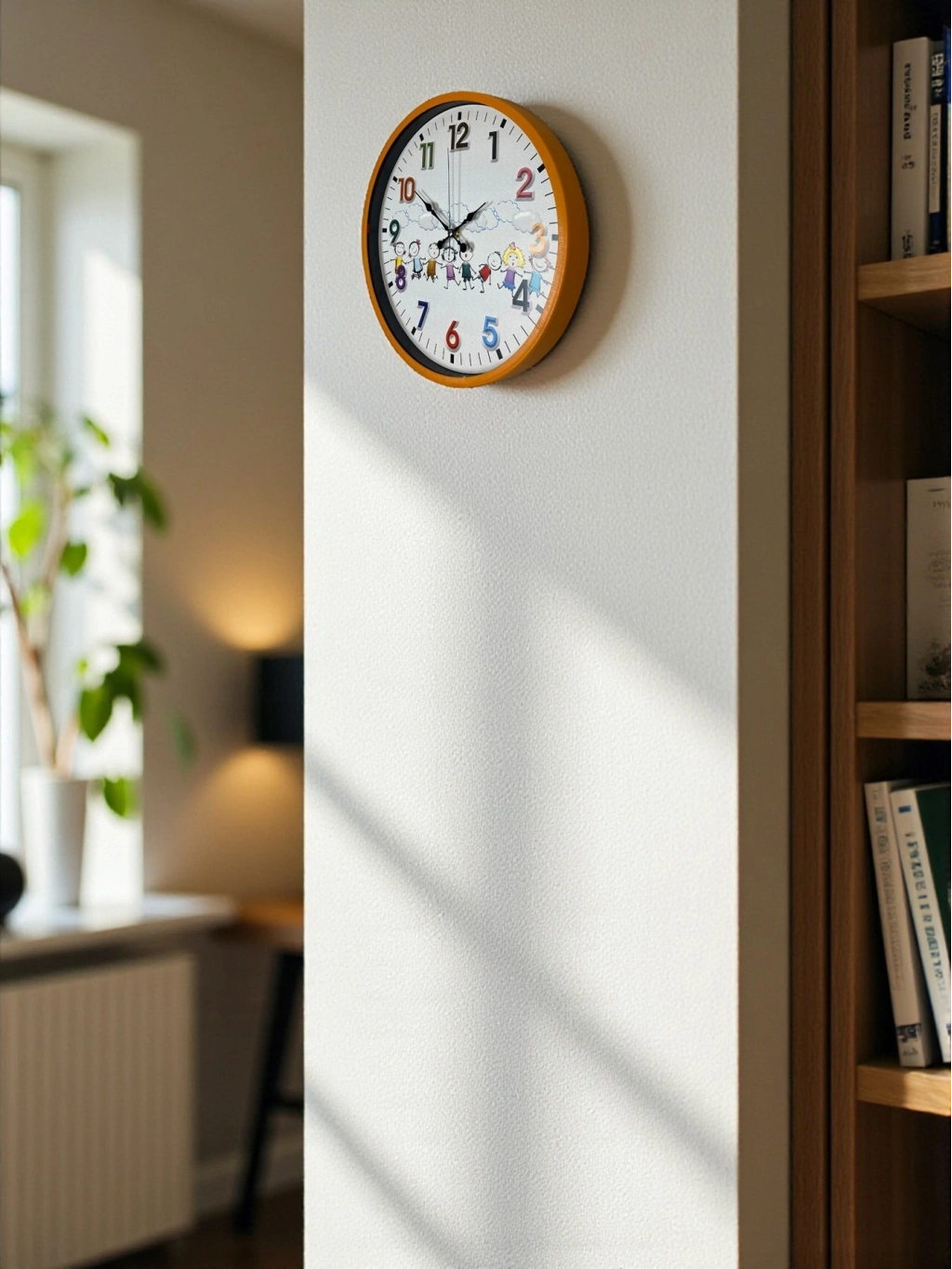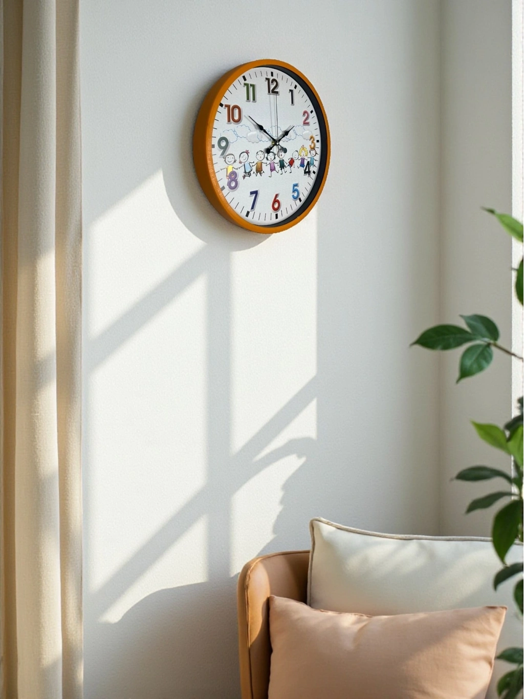 Canlı turuncu çerçevesi, renkli rakamları ve sevimli çocuk figürleriyle tasarlanan bu 36 cm duvar saati, çocuk odalarına enerji ve neşe katar. Eğlenceli kadran tasarımı sayesinde çocukların saati öğrenmesini desteklerken, odanın dekorasyonunu da tamamlar.