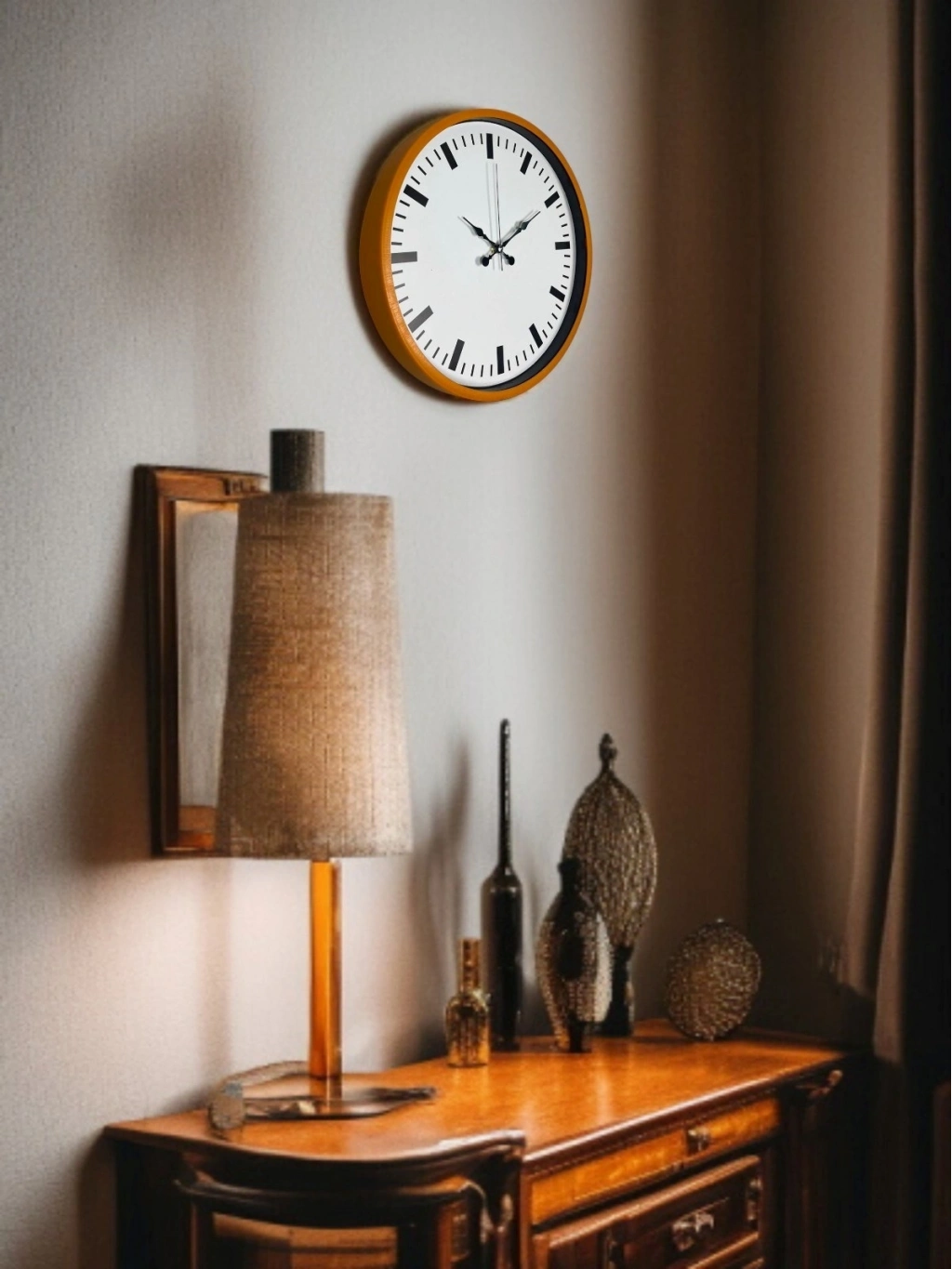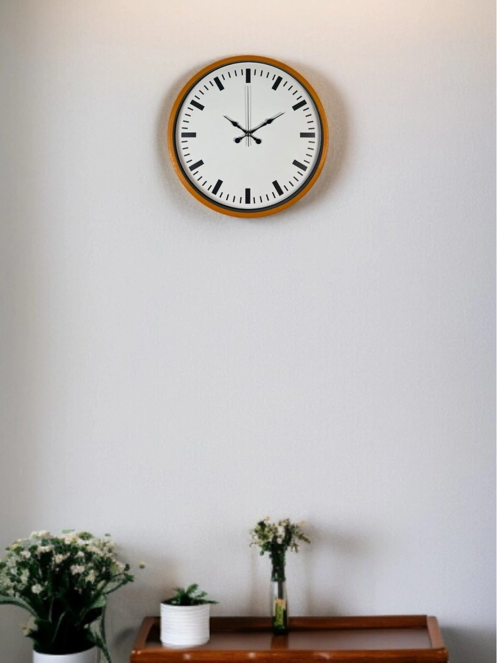 Canlı turuncu çerçevesiyle bulunduğu ortama dinamizm katan bu 36 cm duvar saati, rakamsız ve çizgi indeksli kadran tasarımıyla modern dekorasyonlara güçlü bir uyum sağlar. Beyaz zemin üzerindeki siyah indeksler, saatin okunurluğunu artırırken sade ve şık bir görünüm sunar.