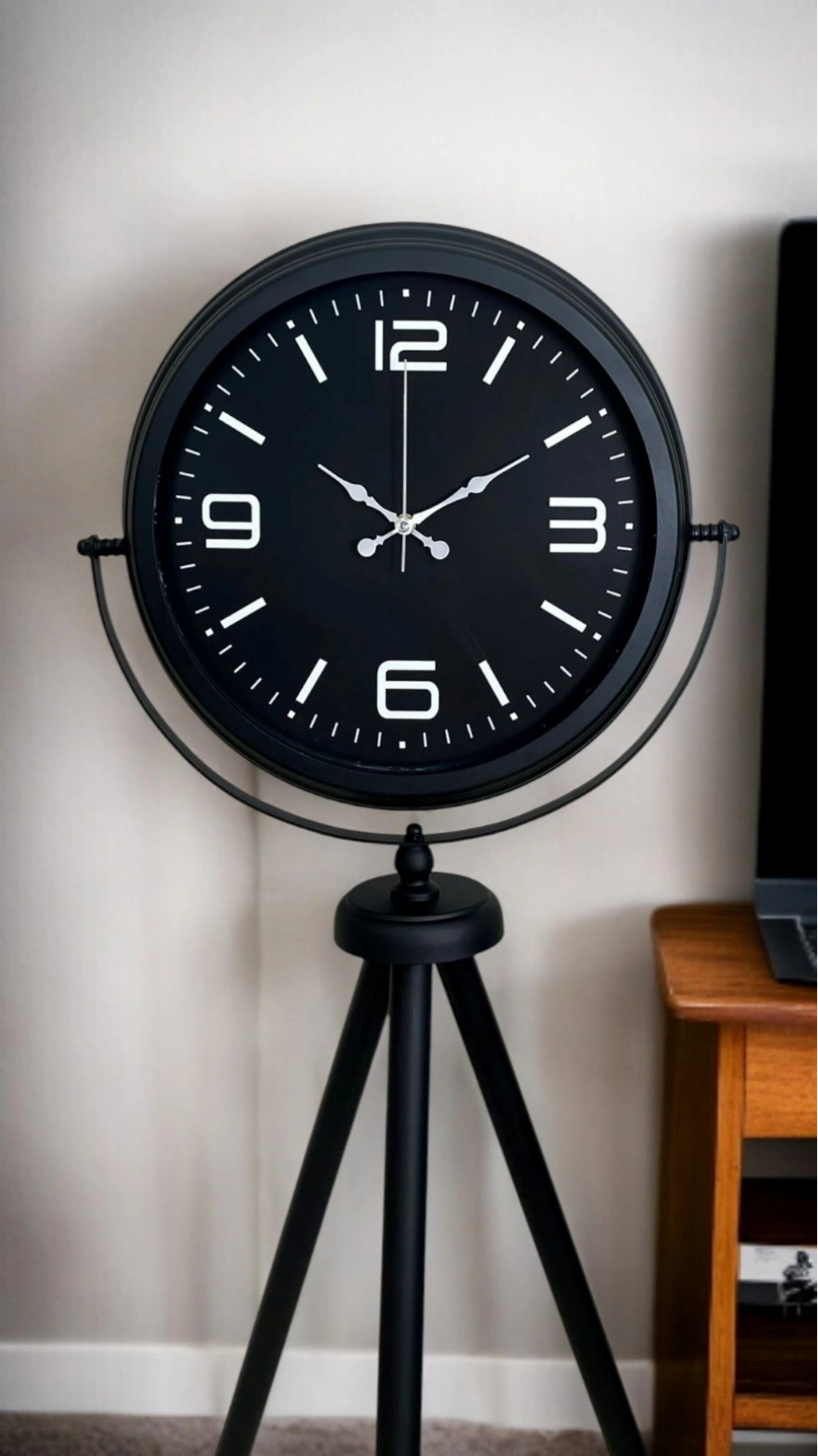 Modern dekorasyonun en güçlü tamamlayıcılarından biri olan Siyah Tripod Ayaklı Dekoratif Salon Saati, 150 x 45 cm ölçüsüyle bulunduğu ortamda dikkat çeken bir “tasarım objesi” etkisi oluşturur. Siyah metal tripod ayak yapısı, ürüne hem şık hem de dengeli bir duruş kazandırırken; modern indeks/çizgi detaylı siyah kadranı sayesinde minimal ve çağdaş bir görünüm sunar. Salon köşeleri, antreler, ofis girişleri, mağaza vitrinleri ve kafe/restoran dekorasyonlarında güçlü bir vurgu oluşturmak isteyenler için ideal bir seçimdir.