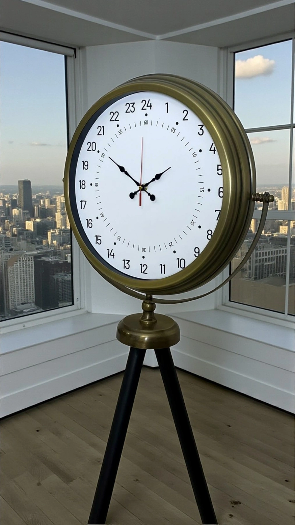 Tripod ayaklı özel tasarımı sayesinde bu model yalnızca bir saat değil, aynı zamanda dekoratif bir yer objesi olarak da öne çıkar. Yüksekliği ve dengeli ayak yapısı sayesinde salon, ofis, lobi, otel, kafe ve restoran gibi geniş alanlarda dikkat çekici bir odak noktası oluşturur.