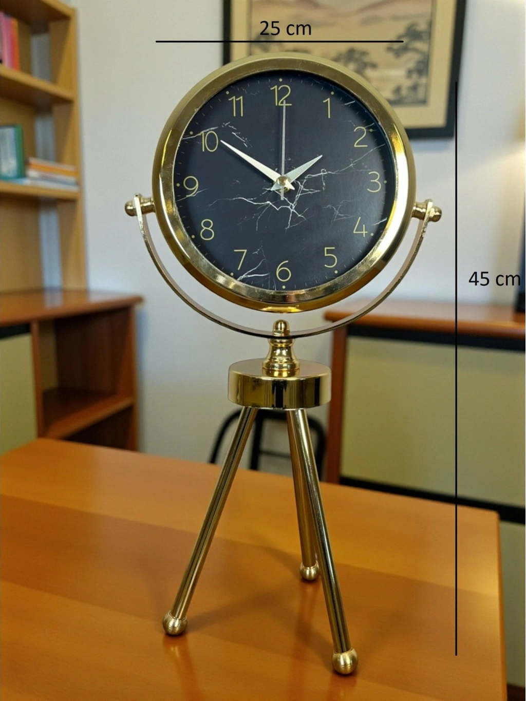 45 x 25 cm ölçülerindeki bu şık gold üç ayaklı masa saati, modern ve zarif tasarımıyla bulunduğu ortama premium bir görünüm kazandırır. Gerçek cam korumalı kadranı sayesinde hem net bir görünüm sunar hem de darbelere karşı daha dayanıklıdır. Metal tripod ayak yapısı ile dekoratif bir obje olarak da dikkat çeker. Sessiz çalışan mekanizmasıyla ev, ofis ve çalışma alanlarında keyifli bir kullanım sağlar.