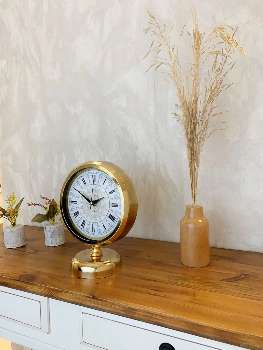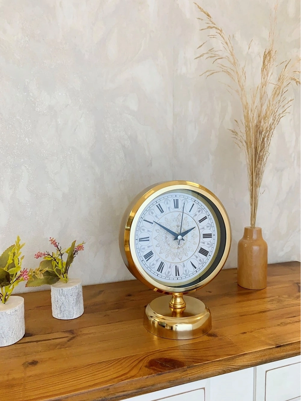 ® Gold Metal Çini Desenli Roma Rakamlı Masa Saati