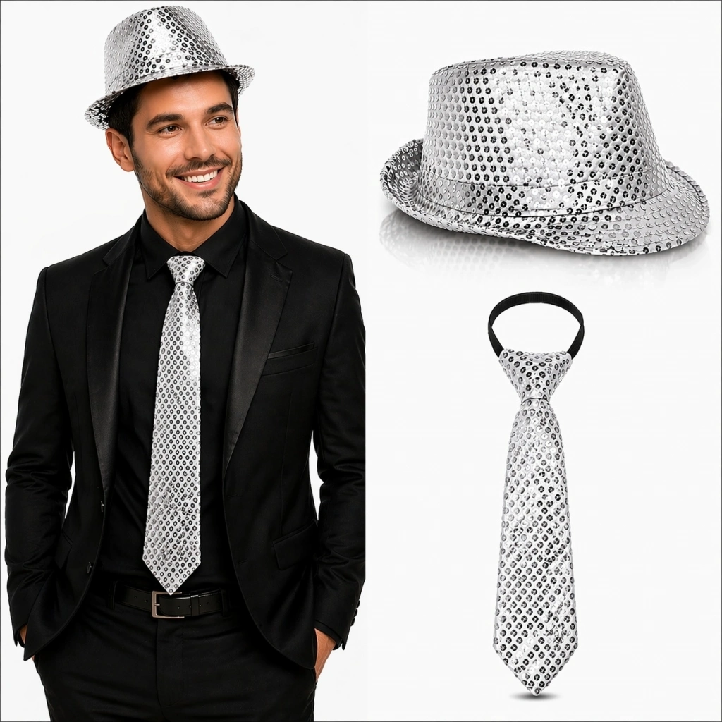 Gümüş Payetli Şapka ve Kravat Seti – Işıltılı Parti Kombini