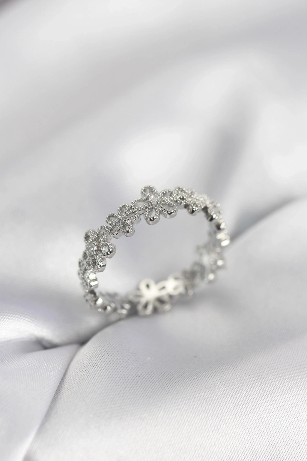 ® Gümüş Renk Sıralı Çiçek Model Zirkon Taşlı Kadın Yüzük