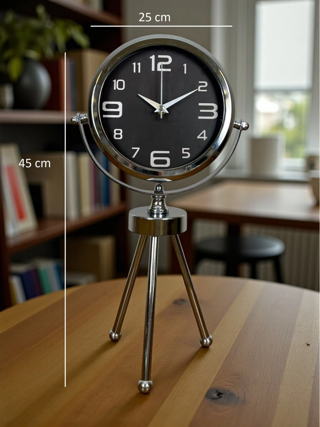 45 x 25 cm ölçülerindeki bu şık krom üç ayaklı masa saati, modern tasarımı ve parlak metal gövdesiyle her ortamda dikkat çeken zarif bir dekorasyon ürünüdür. Gerçek cam korumalı kadranı sayesinde uzun ömürlü ve net bir görüntü sunar. Sessiz çalışan mekanizması ile ev, ofis ve çalışma alanlarında konforlu bir kullanım sağlar. Dayanıklı metal tripod ayak yapısı, saati sadece bir zaman göstergesi değil aynı zamanda estetik bir obje haline getirir.