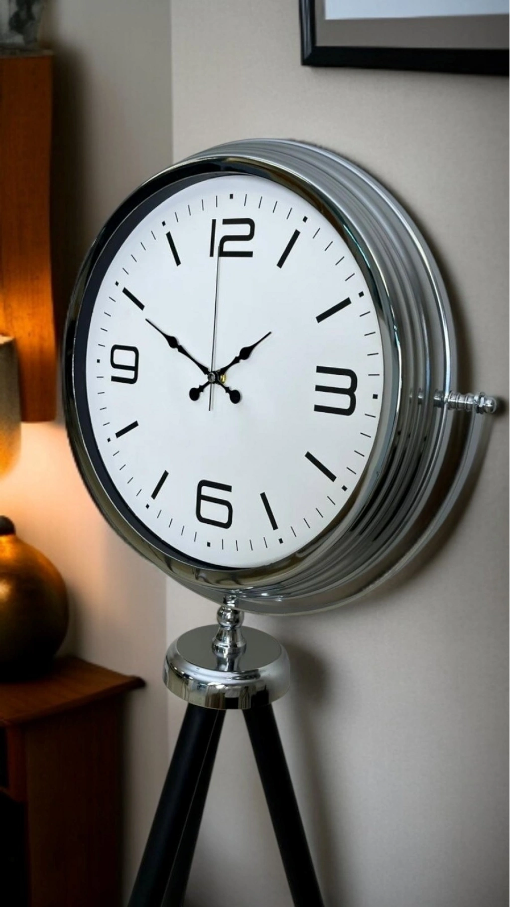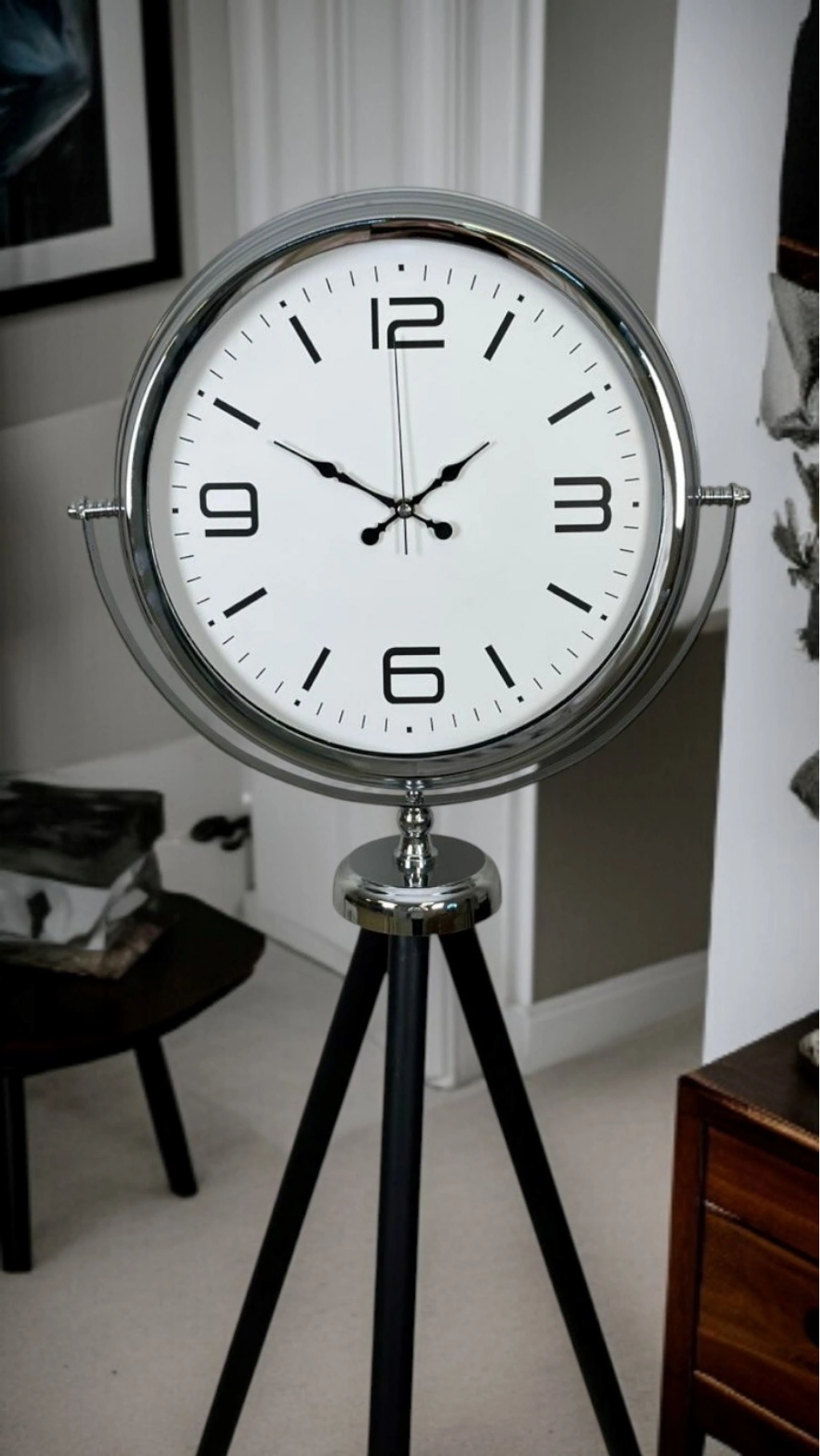 ⏱️ Krom Tripod Ayaklı Dekoratif Saat – 150 × 45 cm (Beyaz Kadran)