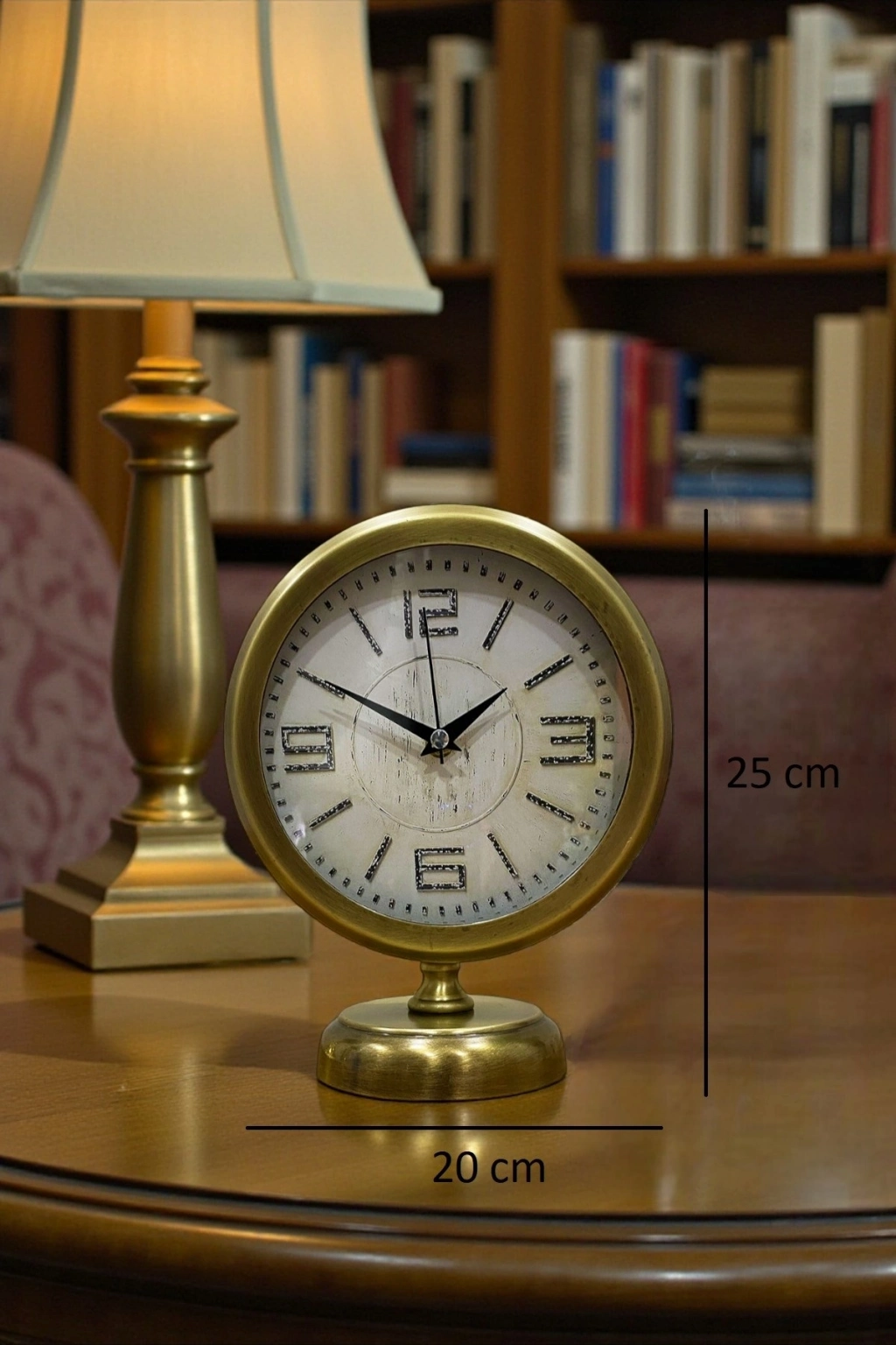 Zarif detayları ve klasik tasarımıyla öne çıkan bu eskitme vintage masa saati, nostaljik ruhu modern yaşam alanlarıyla buluşturur. Krem tonlu kadranı üzerinde yer alan büyük ve karakterli rakamlar, saatin okunabilirliğini artırırken estetik bir duruş sunar. Eskitme efektli metal çerçevesi ve dengeli tabanı sayesinde bulunduğu ortamda güçlü bir dekoratif obje olarak öne çıkar.