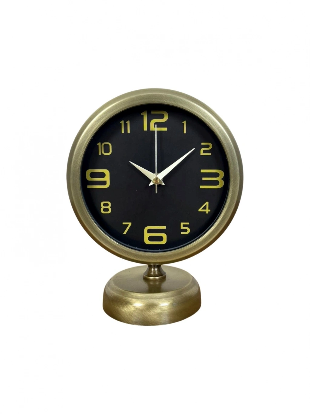 Klasik saat tasarımını modern bir yorumla sunan bu eskitme masa saati, güçlü duruşu ve dikkat çekici detaylarıyla bulunduğu ortama karakter kazandırır. Siyah kadranı üzerinde yer alan büyük ve gold tonlu rakamlar, saatin okunabilirliğini artırırken lüks ve retro bir görünüm sunar. Eskitme metal gövdesi sayesinde vintage tarzı sevenler için vazgeçilmez bir dekoratif tamamlayıcıdır.