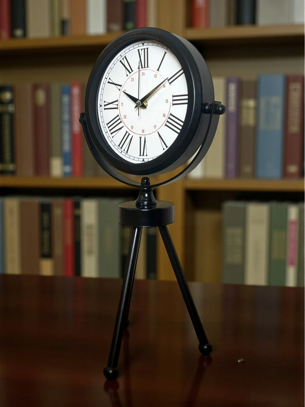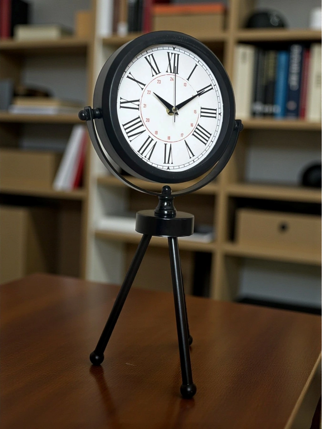 45 x 25 cm ölçülerindeki bu modern siyah üç ayaklı masa saati, minimal tasarımı ve güçlü duruşuyla her ortama şıklık katar. Gerçek cam korumalı kadranı sayesinde net görüntü ve uzun ömürlü kullanım sağlar. Tamamen metal gövdesi ve tripod ayak yapısıyla sağlam, dekoratif ve premium bir görünüm sunar. Sessiz akar saniye mekanizmasıyla ev, ofis ve çalışma alanlarında rahatsızlık vermeden kullanılabilir.
