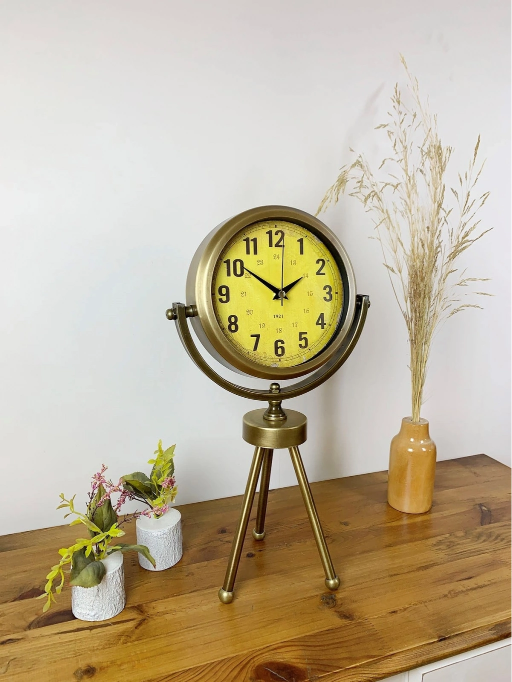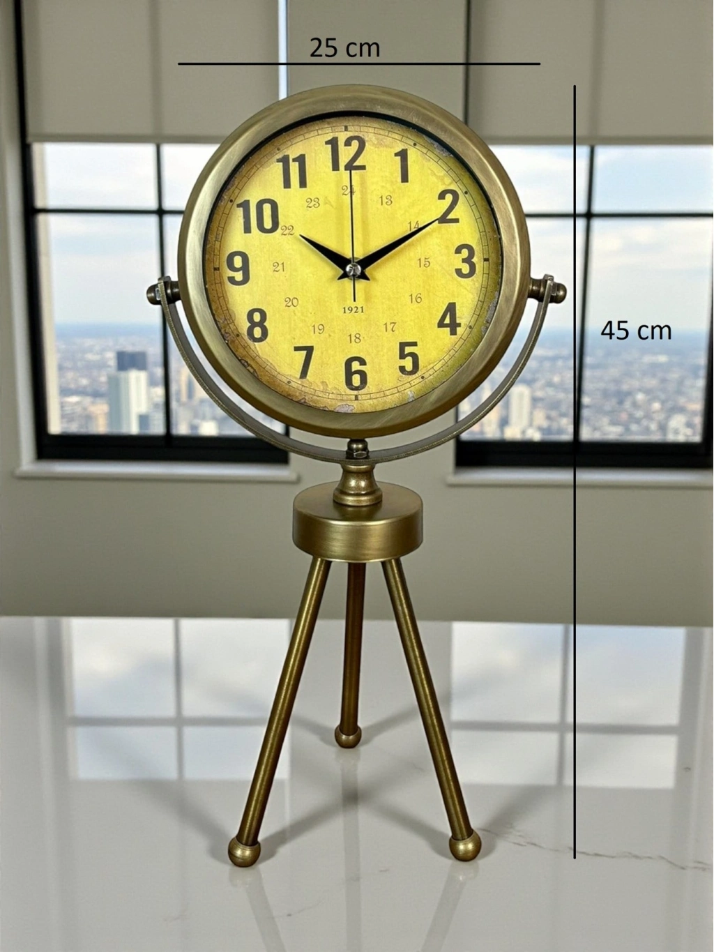45 x 25 cm ölçülerindeki bu şık üç ayaklı metal masa saati, retro tasarımı modern detaylarla birleştirerek bulunduğu ortama zarafet katar. Gerçek cam korumalı kadranı, net görünüm ve uzun ömür sağlar. Metal gövdesi, dayanıklı yapısı ve sessiz çalışmasıyla hem ev hem ofis dekorasyonunda dikkat çeken premium bir parçadır. Şık tripod ayakları sayesinde dekoratif bir obje olarak da ön plana çıkar.