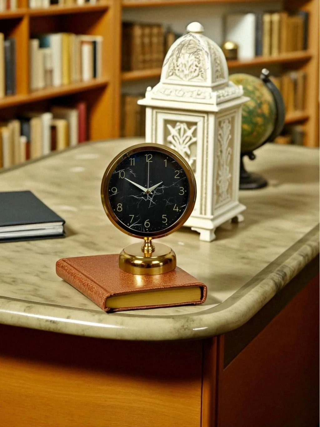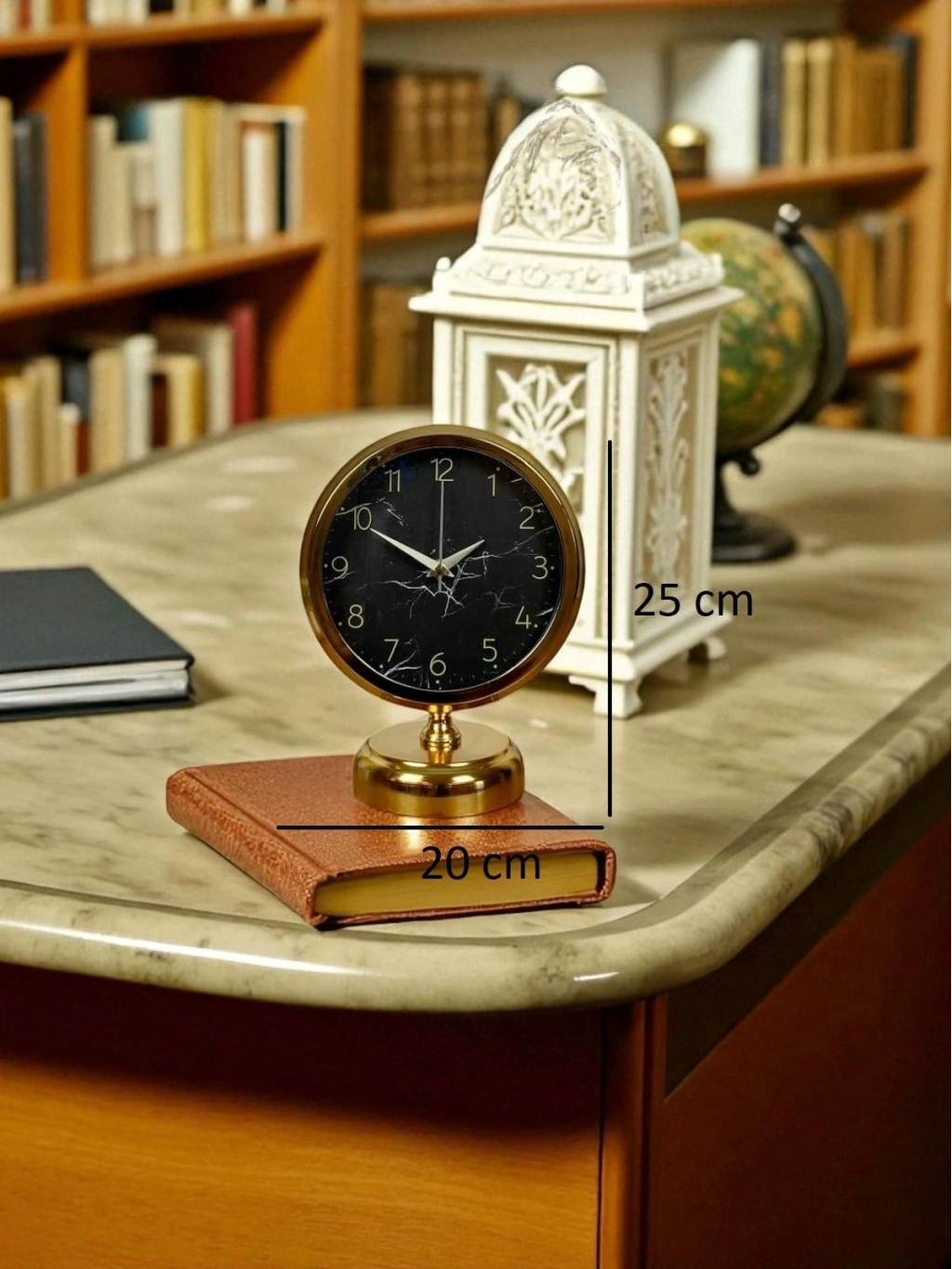 Parlak gold gövdesi ve siyah mermer desenli kadranıyla öne çıkan bu masa saati, dekorasyonda fark yaratmak isteyenler için tasarlanmıştır. Siyah zemin üzerindeki ince mermer efektler saate modern ve sofistike bir karakter kazandırırken, gold rakam ve akrep-yelkovan detayları lüks bir duruş sunar. Klasik yuvarlak formu sayesinde hem modern hem de klasik dekorasyon tarzlarına kolayca uyum sağlar.