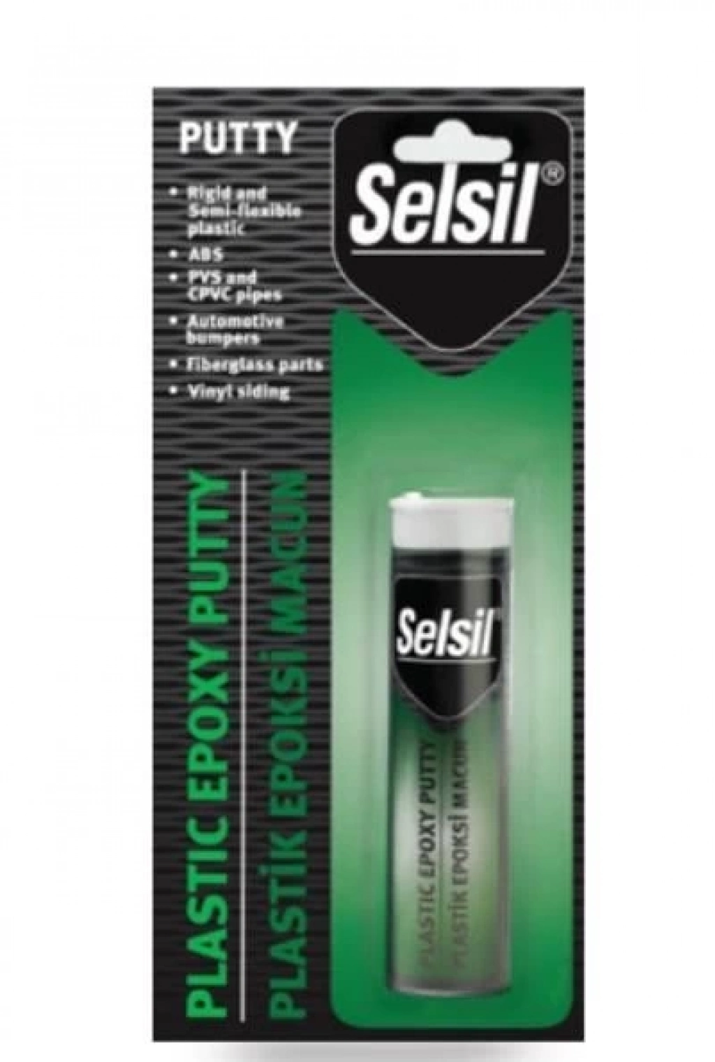 Selsil Epoksi Macun plastik iki bileşenli epoksi yapıştırıcıdır.Epoksi reçine ve sertleştiriciden (1-1) oluşmaktadır.Sert ve yarı esnek plastik,ABS,PVC ve CPVC borular, otomotiv tamponları,fiberglas parçalar,vinil cepheler için uygundur