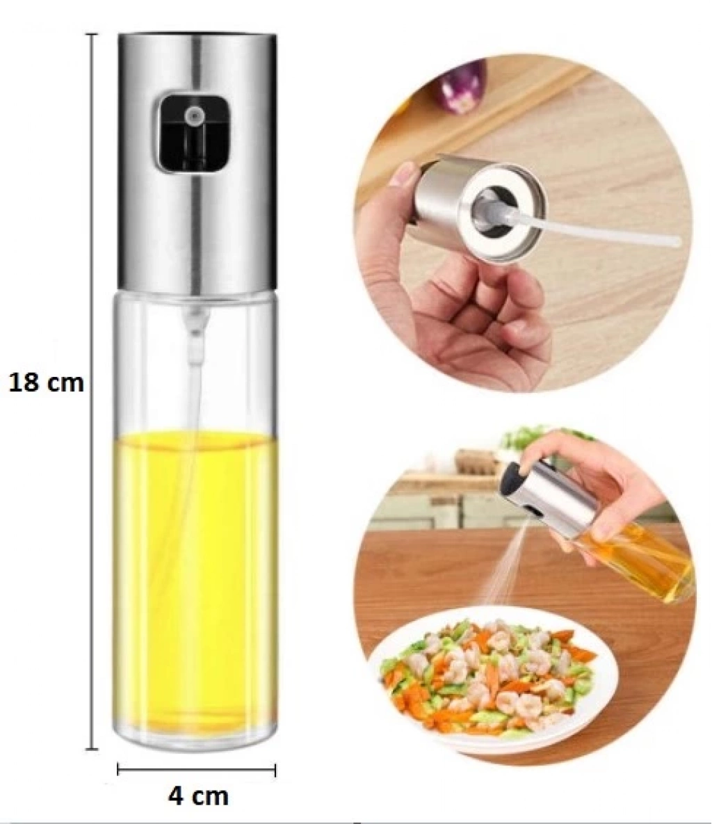 100 ml Çok Amaçlı Spreyli Cam ŞişeÜrün Özellikleri1. Zeytinyağı, soya sosu, sirke ve diğer sıvı çeşnileri için kullanılabilecek Spreyli Cam Şişe malzemesidir.2. Az miktarda sprey, etkili bir şekilde sprey miktarını kontrol edebilir, evde pişirmenin iyi bir yardımcısıdır.3. Cam doku korozyon olmadan sıvıların her türlü tutabilir. Şişe gövdesi şeffaftır ve sıvıyı takip edebilirsiniz.4. Pişirme, barbekü, salata vb.için kullanılabilir.Ürün malzemesi: Cam gövde + ABS kapKapasite: 100 mlÇap: 4 cm Yükseklik: 18 cmBaşlık Renk: GümüşPaket İçeriği1 Adet 100 ml Çok Amaçlı Spreyli Cam Şişe