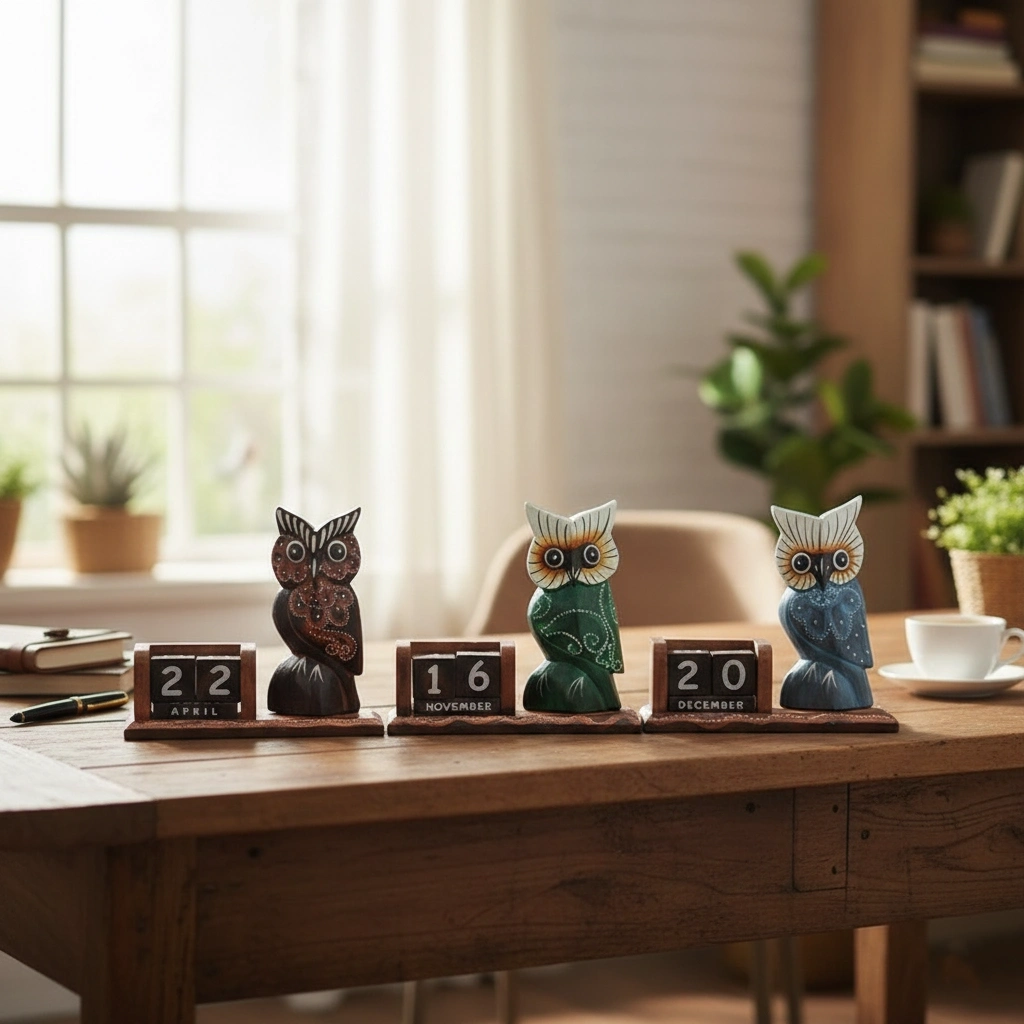 Ahşap Baykuş Takvim Büyük BoyÜrün İçeriğiAhşap Baykuş Takvim, zamansız tasarımıyla hem dekoratif bir obje hem de ömürlük bir planlayıcıdır. Doğal ahşabın sıcaklığını el işçiliğiyle buluşturan bu büyük boy model, masanızda sadece tarihi göstermekle kalmaz, aynı zamanda estetik bir duruş sergiler. Değiştirilebilir blok yapısı sayesinde pille veya kağıt israfıyla uğraşmadan, her yıl ve her ay keyifle kullanabileceğiniz çevre dostu bir aksesuardır.Ürün ÖzellikleriÖzellikAçıklamaÜrün TipiSonsuz Masa TakvimiTemaBaykuş Figürlü / Doğal YaşamMateryalYüksek Kaliteli Doğal AhşapBoyut14 x 15 cm (Büyük Boy)İşçilikEl İşçiliği ve Özel BoyamaFonksiyonGün, Ay ve Tarih Ayarlı Blok SistemiKullanım AlanıOfis, Çalışma Masası, Kitaplık ve Ev DekorasyonuPaket İçeriği1 Adet Ahşap Baykuş Takvim (Büyük Boy)