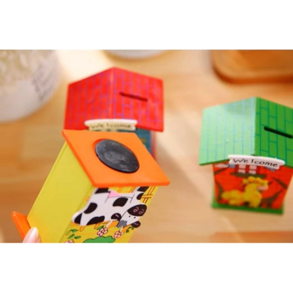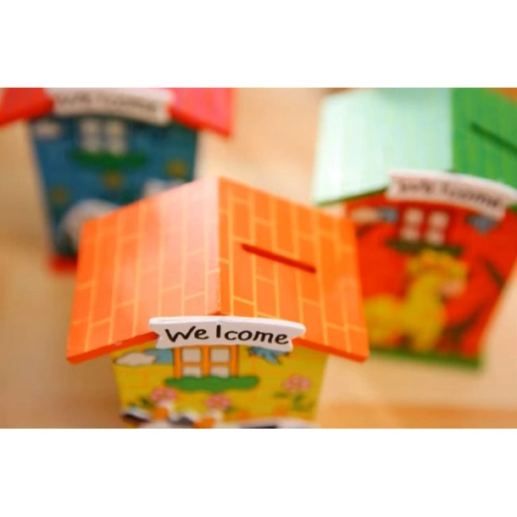 AHŞAP EV TASARIMLI KUMBARAÜrün ÖzellikleriÇocuklar için tasarlanmış hem dekoratif hem de fonksiyonel bir Ahşap Ev Tasarımlı Kumbara modelidir. Ahşap malzemeden üretilmiş olup dayanıklı bir yapıya sahiptir. Üzerinde yer alan renkli hayvan figürleri ve "Welcome" yazısı, çocukların ilgisini çekerken odalarına eğlenceli bir hava katar.Alt kısmında bulunan kapak sayesinde birikimler kolayca alınabilir ve yeniden kullanılabilir. Farklı renk ve desen seçenekleri ile her zevke hitap eder.Hem para biriktirme alışkanlığı kazandırmak hem de odada dekoratif bir obje olarak kullanılmak için ideal bir üründür. Hafif ve taşınabilir olması sayesinde istenilen her yerde rahatlıkla kullanılabilir.Eğitim materyali, hediye veya dekoratif amaçlarla tercih edilebilir.Çocukların finansal farkındalık geliştirmesine yardımcı olurken, odalarına şık bir görünüm kazandırır.Paket İçeriği1 adet Ahşap Ev Tasarımlı Kumbara