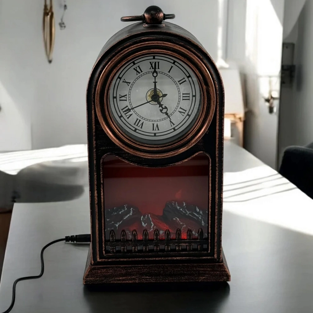 LED Işıklı Siyah Eskitme Şömine Saat