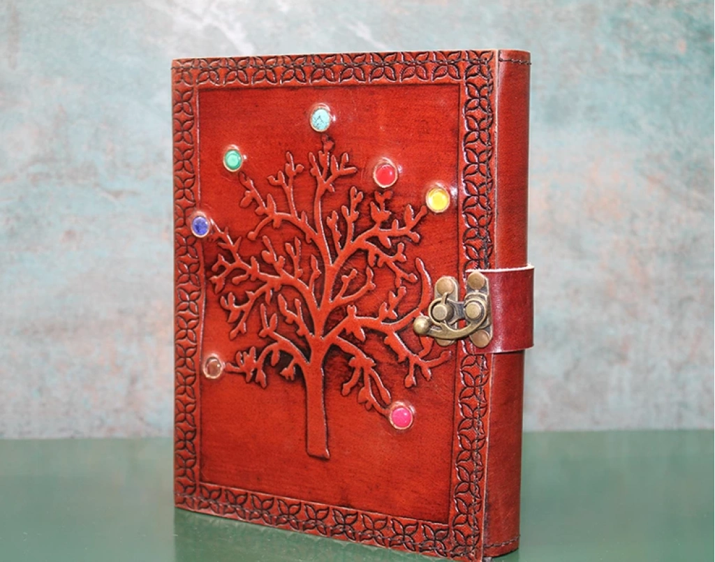 TAŞLI DERİ DEFTER MODEL 6Ürün ÖzellikleriTaşlı Deri Defter Model 6, hayat ağacı işlemeli, renkli taşlarla süslenmiş şık ve zarif bir defterdir. Deri kapak üzerine işlenmiş hayat ağacı figürü, doğanın döngüsünü ve yaşamın sürekliliğini simgeler. Renkli taşlar deftere hem görsel bir zenginlik katar hem de onu benzersiz kılar. 20x15 cm ölçülerindeki ideal boyutu, yazı yazarken rahatlık sağlar ve günlük kullanım için oldukça uygundur. Hem kişisel kullanım hem de hediye olarak harika bir tercihtir. El yapımı tasarımı ve kaliteli malzemesiyle uzun süreli kullanım sunar.Paket İçeriği1 adet Taşlı Deri Defter Model 6.