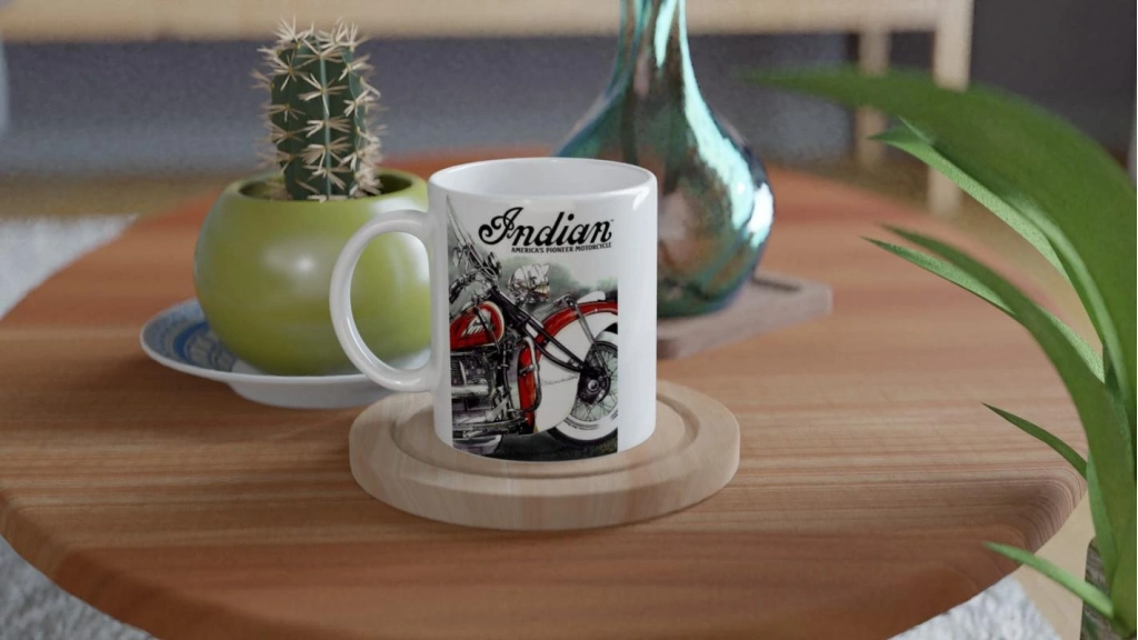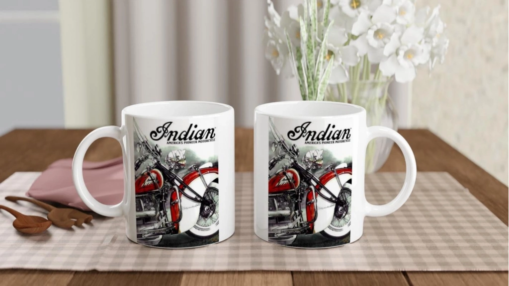 Kırmızı beyaz renkleri ve detaylı çizimiyle öne çıkan bu Indian motosiklet baskılı kupa bardak, koleksiyon değeri taşır.