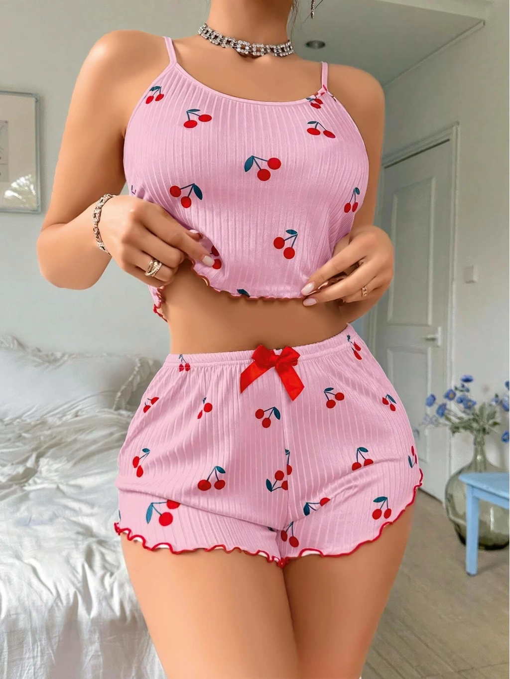 Pembe kiraz desenli askılı şortlu pijama takımı, enerjik ve eğlenceli bir görünüm kazandırır. Yumuşak dokusu ile konfor sağlar.