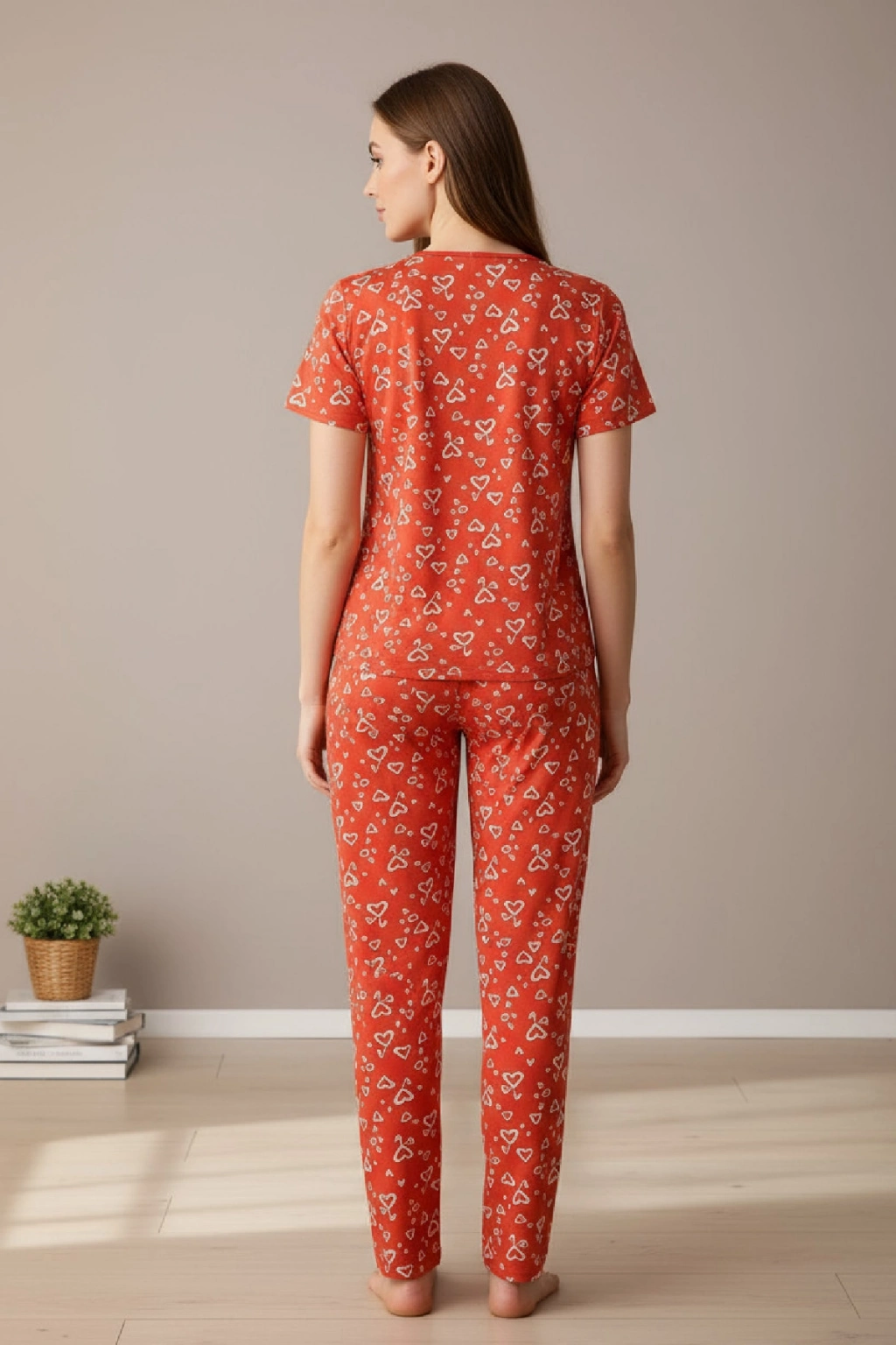 • Canlı ve enerjik tarzıyla dikkat çeken Kadın Turuncu Kalp Desenli Fiyonklu Kısa Kollu Uzun Pijama Takımı, evde geçirdiğiniz her ana pozitif enerji katıyor.