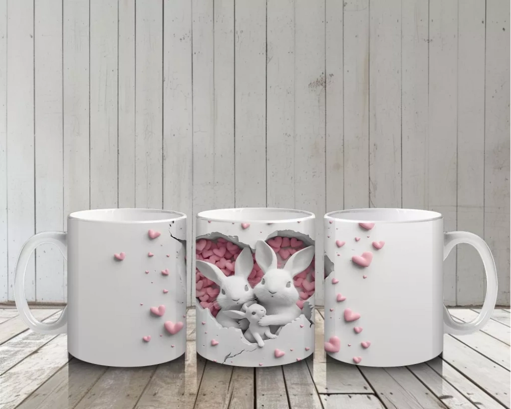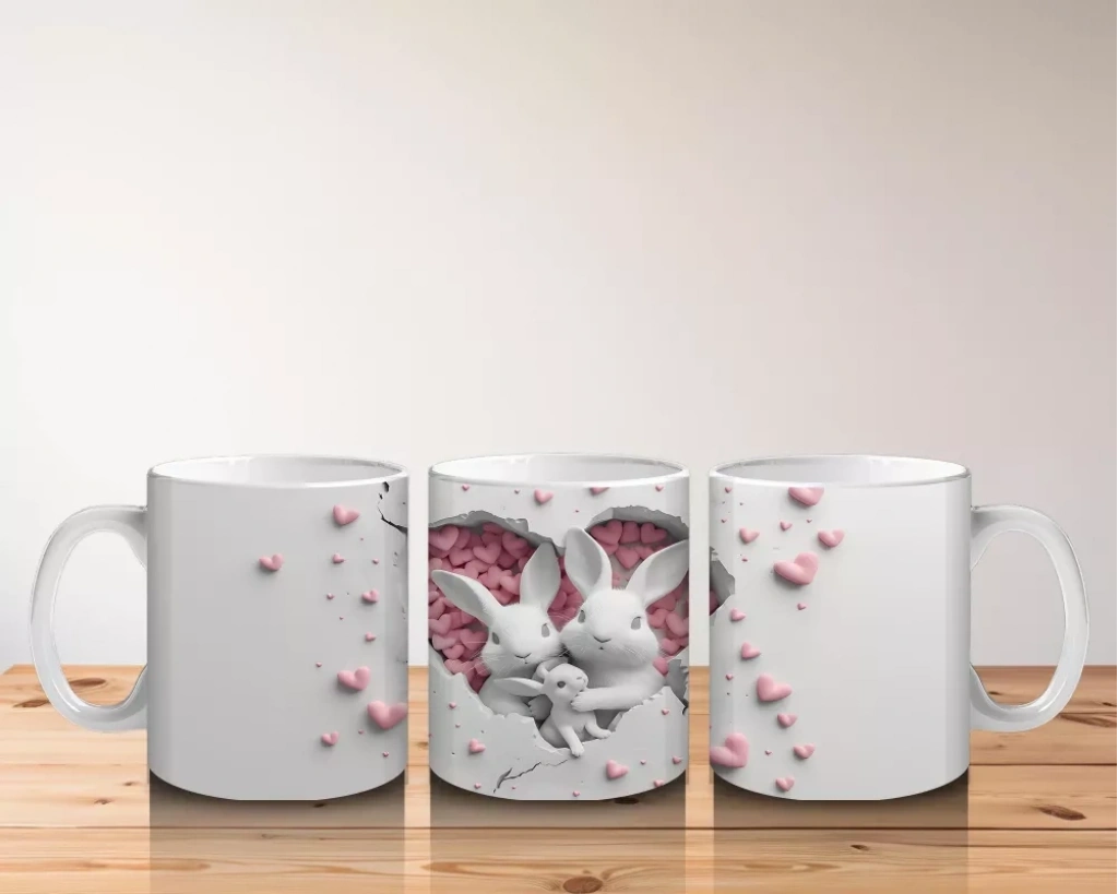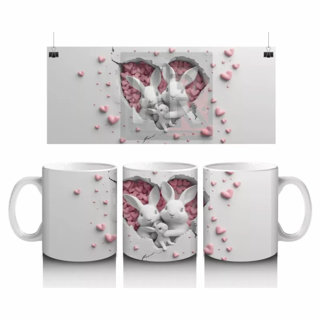 Kalplerle bezeli arka planda yan yana duran tatlı ikiz tavşanlar! Bu tasarım, sıcaklık ve sevgi temasıyla dolu özel bir hediye alternatifi.