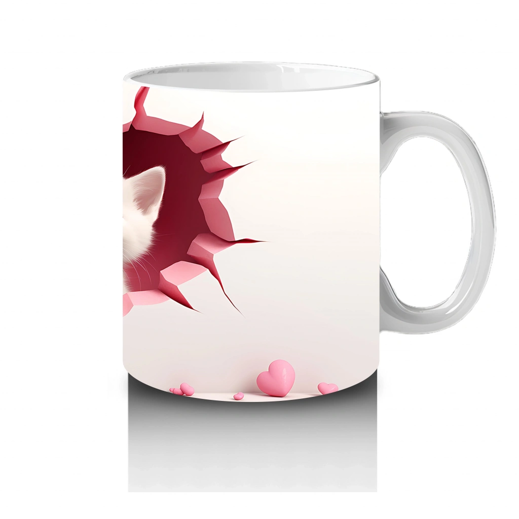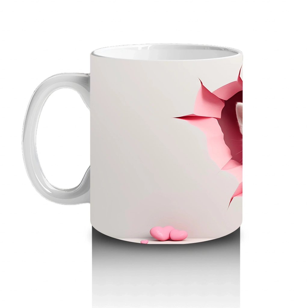 Tatlı bakışlarıyla kalp şeklindeki duvardan görünen iki yavru köpek, dostluğun ve sadakatin neşeli temsilcileri. Gülümseten her an için ideal bir kupa.